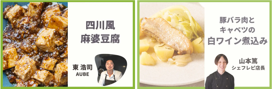 「AUBE」東浩司シェフの「四川風麻婆豆腐」または、シェフレピ店長山本篤「 豚バラ肉とキャベツの白ワイン煮込み」のどちらかを選ぶことができます。