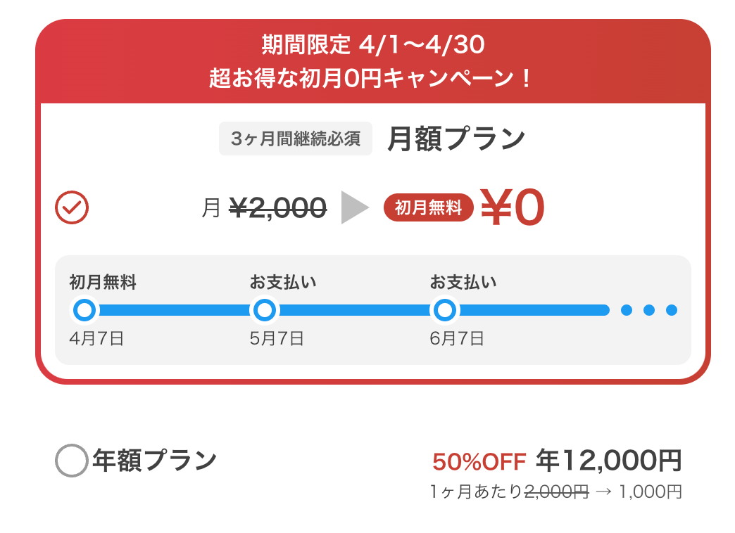 2,000円×12カ月=24,000円→12,000円(1カ月当たり1,000円、50%OFF)