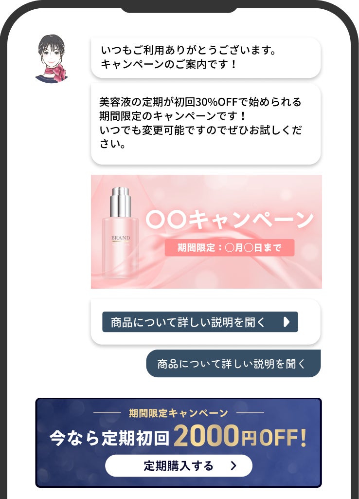 チャットページは会話速度を最適化し、ユーザーの心情に寄り添うことでWeb上でありながら、温かみのある心地よいコミュニケーションを体現します。この体験がユーザーの自発的な意思決定を促し、CV向上のみならず、LTV(顧客生涯価値)改善まで見据えた企業の成長を支援します。