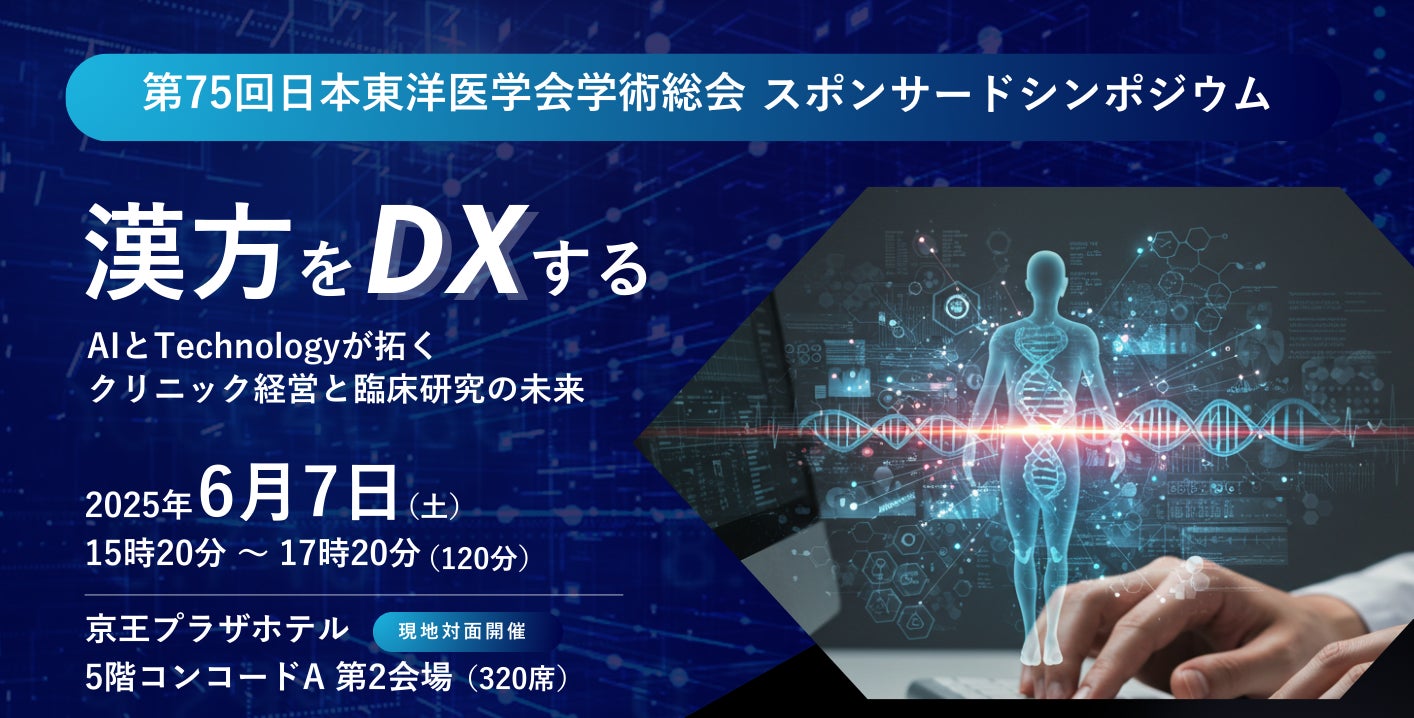 そのような中、当社は、漢方ソフトウェア共同開発事業基本協定書を締結している日本東洋医学会様の学術総会において、スポンサードシンポジウムを共催させていただく機会を頂戴いたしました。シンポジウムでは、漢方医学の専門家であると同時に、DXへの深い見識を持ち、実際の臨床や研究においても積極的に活用されている著名な先生方にご登壇いただきます。