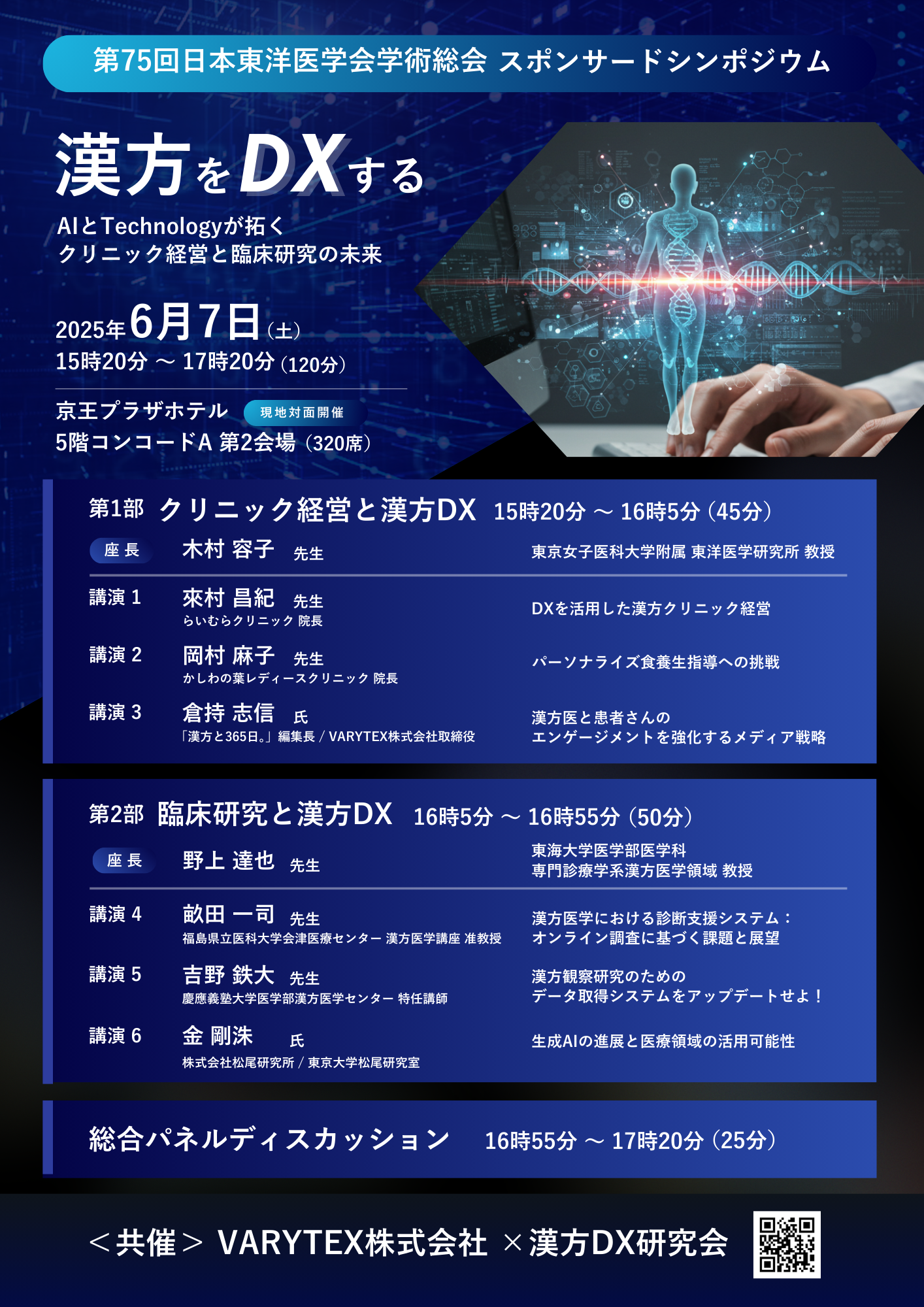 VARYTEX株式会社(本社:東京都港区、代表取締役:平野喜一郎)は、2025年6月6日(金)~8日(日)に開催される第75回日本東洋医学会学術総会において、6月7日(土)にスポンサードシンポジウムを実施いたします。