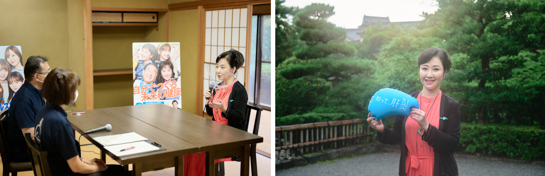この度7月17日(日)に、「知って、肝炎プロジェクト」肝炎対策特別大使を務める伍代 夏子氏が愛知県岡崎市を訪問しました。岡崎市の皆さんに、「特に若い世代の方は、自分はまだ大丈夫と思っている方が多いのですが、年齢に関係なく肝炎になってしまう可能性があります。是非、市の制度である無料検査を利用したり、健康診断の時のタイミングで肝炎ウイルス検査を受けてください。早期発見・早期治療のために積極的な行動をお願いいたします。」と呼びかけました。
