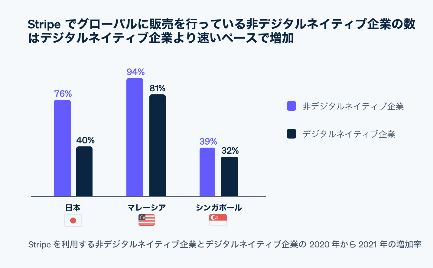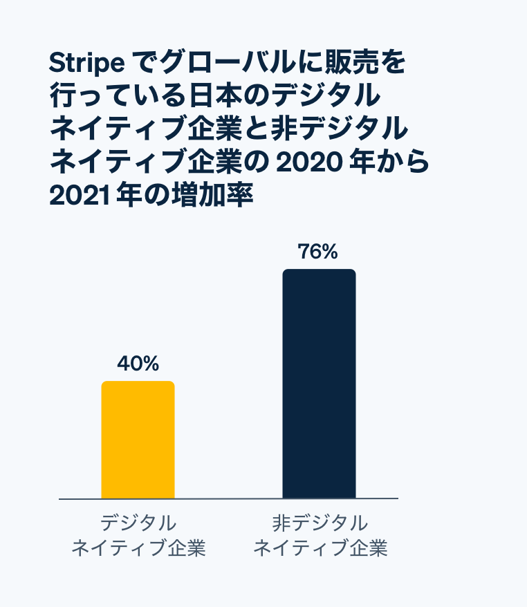 Stripe を通じて越境ビジネスを行う非デジタルネイティブ企業*の数は、デジタルネイティブ企業よりも早いペースで増加しています。2021 年にグローバルに販売を行う日本の非デジタルネイティブ企業と中小企業の数は前年比 76%、デジタルスタートアップおよびデジタルネイティブ企業については同 40 % 増加しました。これは、企業が販売機会を拡大する際の障壁をデジタルプラットフォームが取り除いていることを示しています。