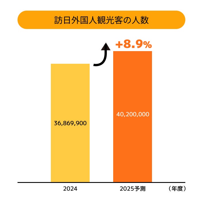 2024年度に日本に訪問した外国人観光客は約 3,600 万人※1 であり、2025年度は 8.9%※2 増加する見込みとされています。さらに、2024年度の訪日外国人は日本で約8兆円を消費し、そのうち21.5%※3 が飲食で利用され、多くの割合を飲食が占めていると言われています。