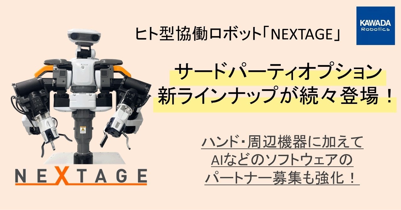 ヒト型協働ロボット「NEXTAGE(ネクステージ)」を展開するカワダロボティクス株式会社(東京都台東区 代表取締役社長:川田忠裕)は、「NEXTAGE」の汎用性を更に拡大(「NEXTAGE」と組み合わせて使用できる機能を拡張)しているほか、短期間での本格稼働のサポートを可能にする周辺機器・ソフトウェアのパートナー企業様による「サードパーティオプション」を募集し、ラインナップを増やしております。