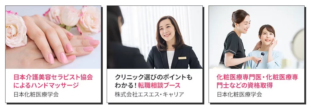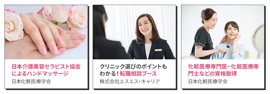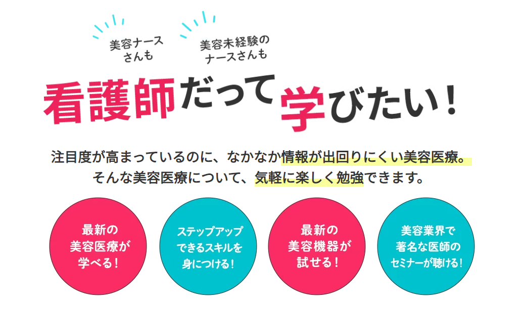 美容医療の治療についてはもちろん、知らなきゃ損する看護師のためのマネーセミナーや、美容医療業界のトレンドと美容ナースのキャリアパスなど、美容医療業界で看護師が生きていくために必要な情報をご紹介するセミナーも必見です。