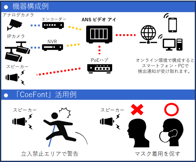 全日警が提供する「ANSビデオアイ」を使用する顧客の要望に対して、「CoeFont」で提供される音源の使用許諾から音声ファイルの作成、機器へのインストールまでをサービスとして提供。