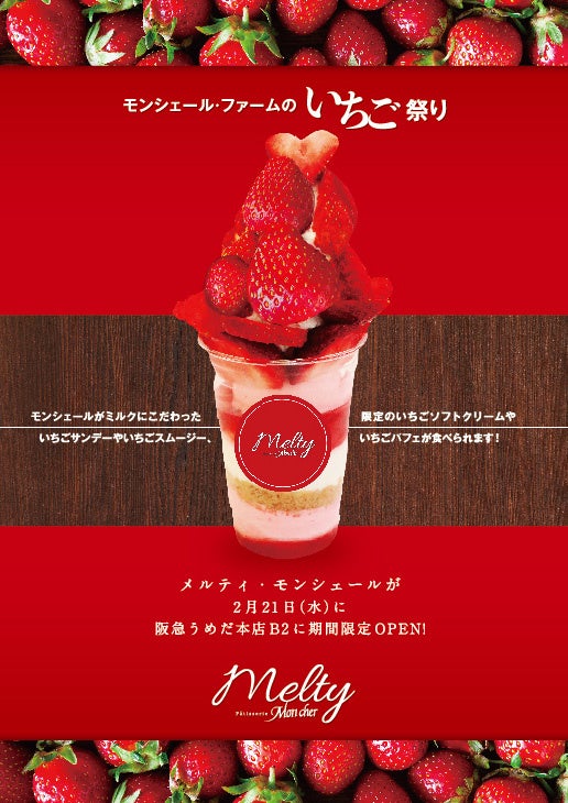 《モンシェール・ファームのいちご祭り》!モンシェールがミルクにこだわった限定のいちごソフトクリームやいちごサンデーやいちごスムージー、いちごパフェが楽しめます!