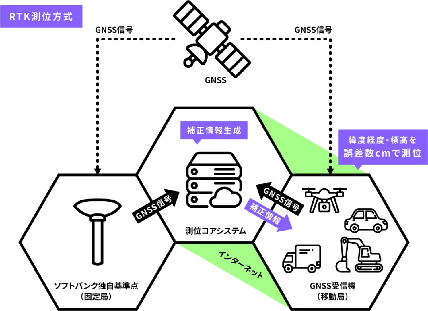 ソフトバンクの独自基準点が受信した信号を基に、「測位コアシステム」で補正情報を生成し、ソフトバンクのインターネットを通して農機や建機、自動運転車、ドローンなどに搭載されたGNSS受信機(移動局)へ補正情報を配信します。この補正情報と、GNSS受信機が受信した信号を活用してRTK測位を行うことで、誤差数センチメートルの高精度ば測位がリアルタイムで可能になります。