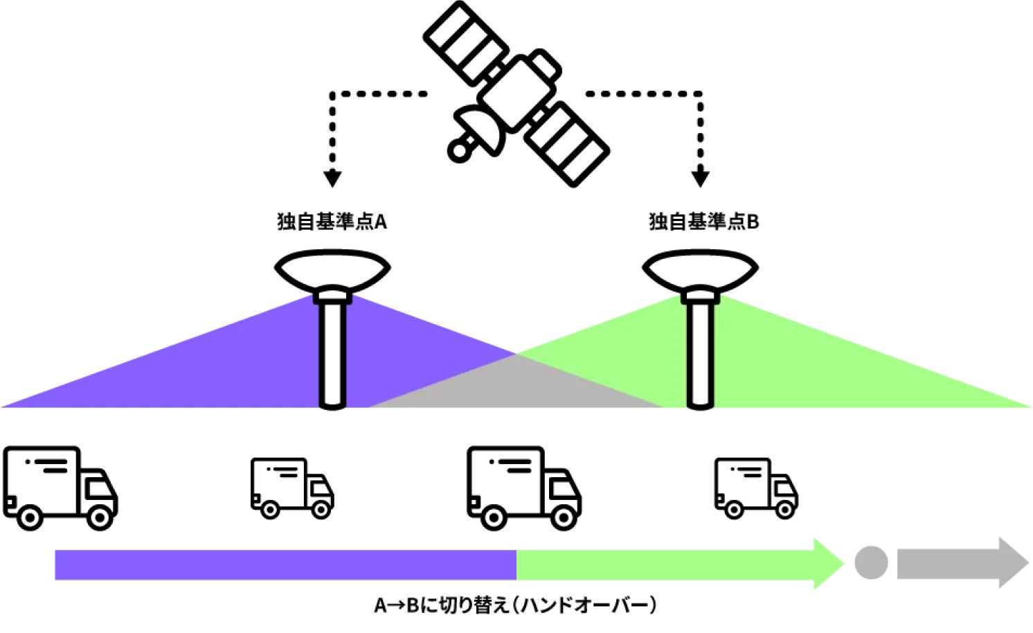 全国に高密度で基準点を配備しているため、非常に短い時間の切り替え(ハンドオーバー)で安定的な測位を実現します。基準点をまたぐような長い距離を移動する際も、継続して高精度な測位が可能となります。