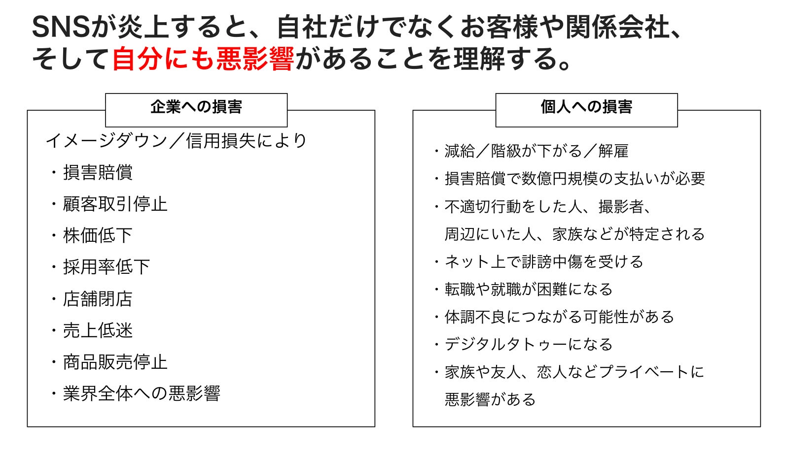 また、炎上による影響は企業アカウントに限らず、減給・解雇、損害賠償、誹謗中傷、就職や転職への影響、デジタルタトゥー化などのリスクが示されています。