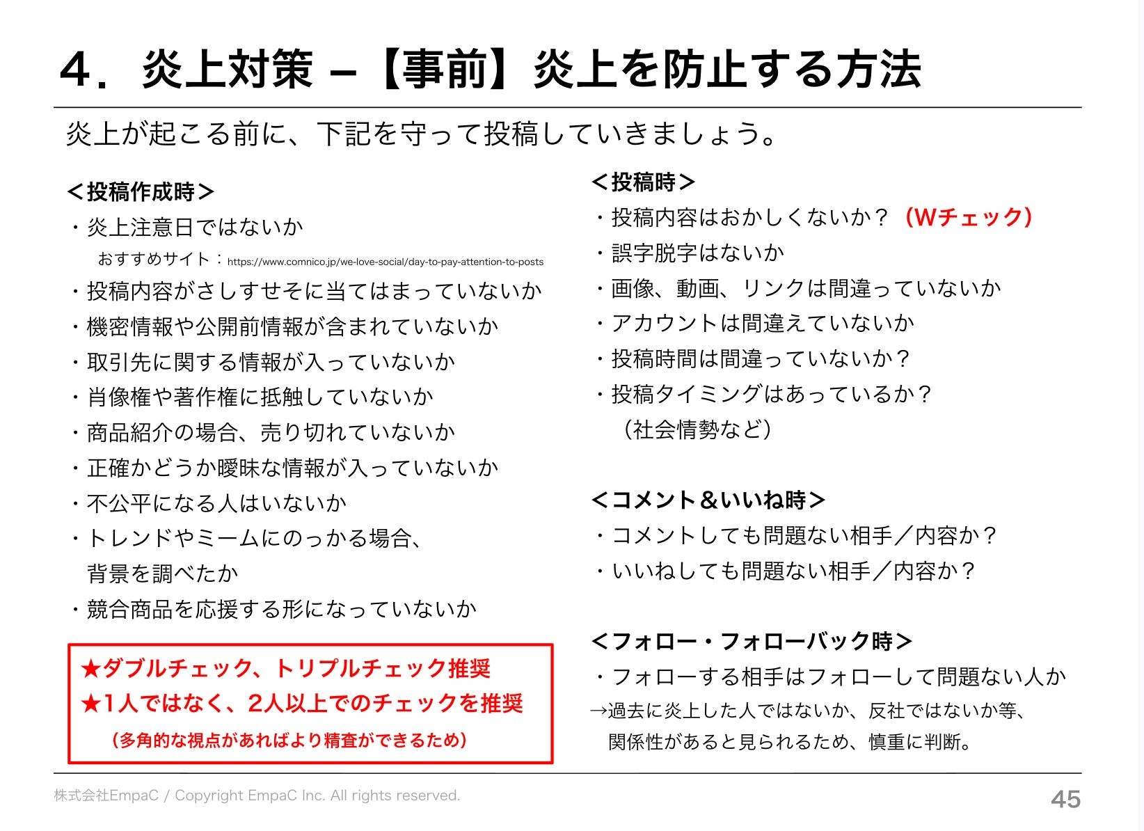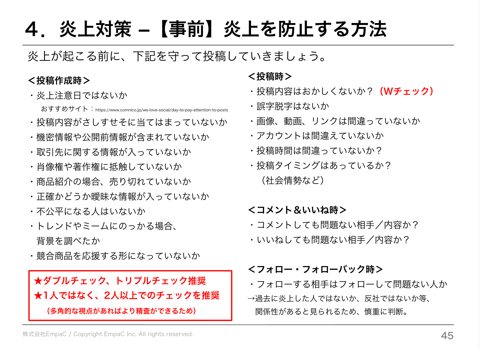 今後EmpaCでは、企業向けのSNS炎上対策研修に加え、部門別・業種別・階層別に内容を最適化した研修設計や、SNSガイドライン整備、緊急時対応フロー構築、運用体制設計支援まで一貫して提供してまいります。
