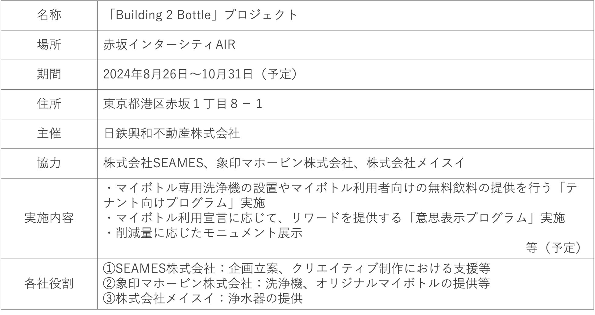 社会課題の解決に対する「意識が高い」「難しい」というイメージを払拭し、エンタメの力で面白く、楽しく、発見や感動に溢れた解決に挑む株式会社SEAMES(本社:東京都目黒区、代表者:コミンズ リオ、以下SEAMES)は、日鉄興和不動産株式会社(本社:東京都港区、代表取締役社長:三輪 正浩)、象印マホービン株式会社(本社:大阪市北区、代表取締役 社長執行役員:市川 典男)、株式会社メイスイ(本社:東京都品川区、代表取締役:永井 秀樹)と協力し、マイボトルの利用を促進するプロジェクト「Building 2 Bottle(以下、本プロジェクト)」を2024年8月26日~10月31日、赤坂インターシティAIR(東京都港区赤坂1丁目8−1)にて実施予定です。