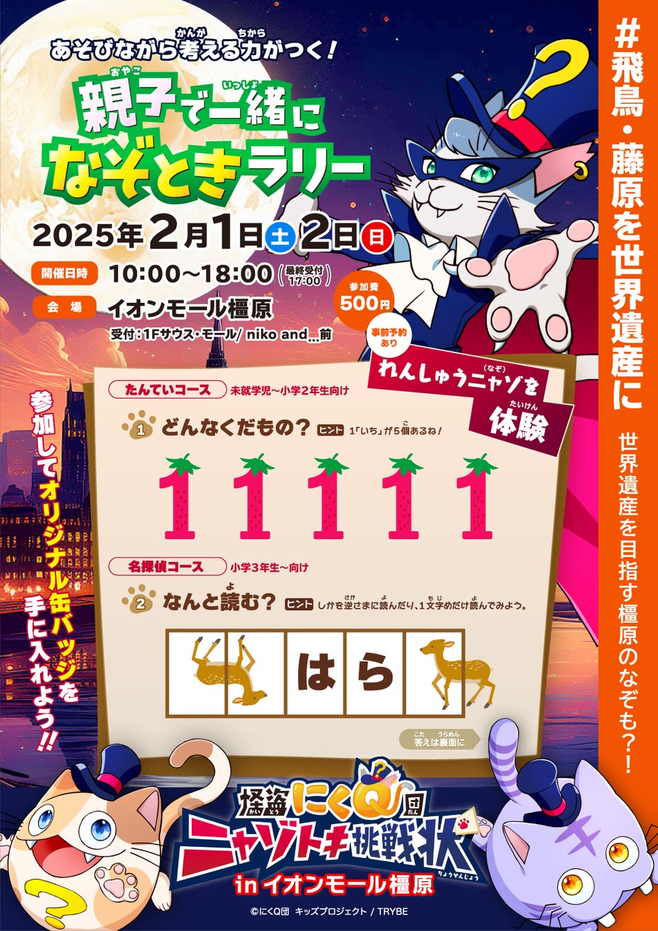 奈良県橿原市「イオンモール橿原」での開催では、「飛鳥・藤原の宮都」の世界遺産登録を目指す取り組みと連動したなぞを展開し、多くの親子に地域の歴史や文化を伝える機会となりました。今後も地域や施設とコラボレーションし、教育とエンターテインメントを掛け合わせた新しい体験を全国に広げていきます。