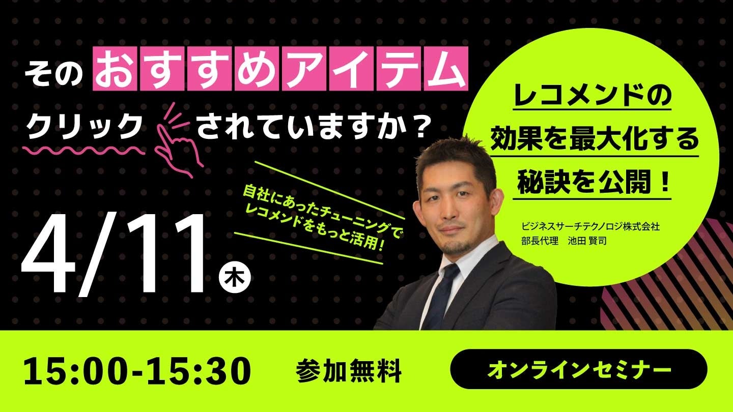 ビジネスサーチテクノロジ株式会社(本社:東京都新宿区、代表取締役社長:工藤智昭、以下「BST」)は、4月11日(木)に無料オンラインセミナー【その”おすすめアイテム”クリックされていますか?レコメンドの効果を最大化する秘訣を公開!】を開催いたします。