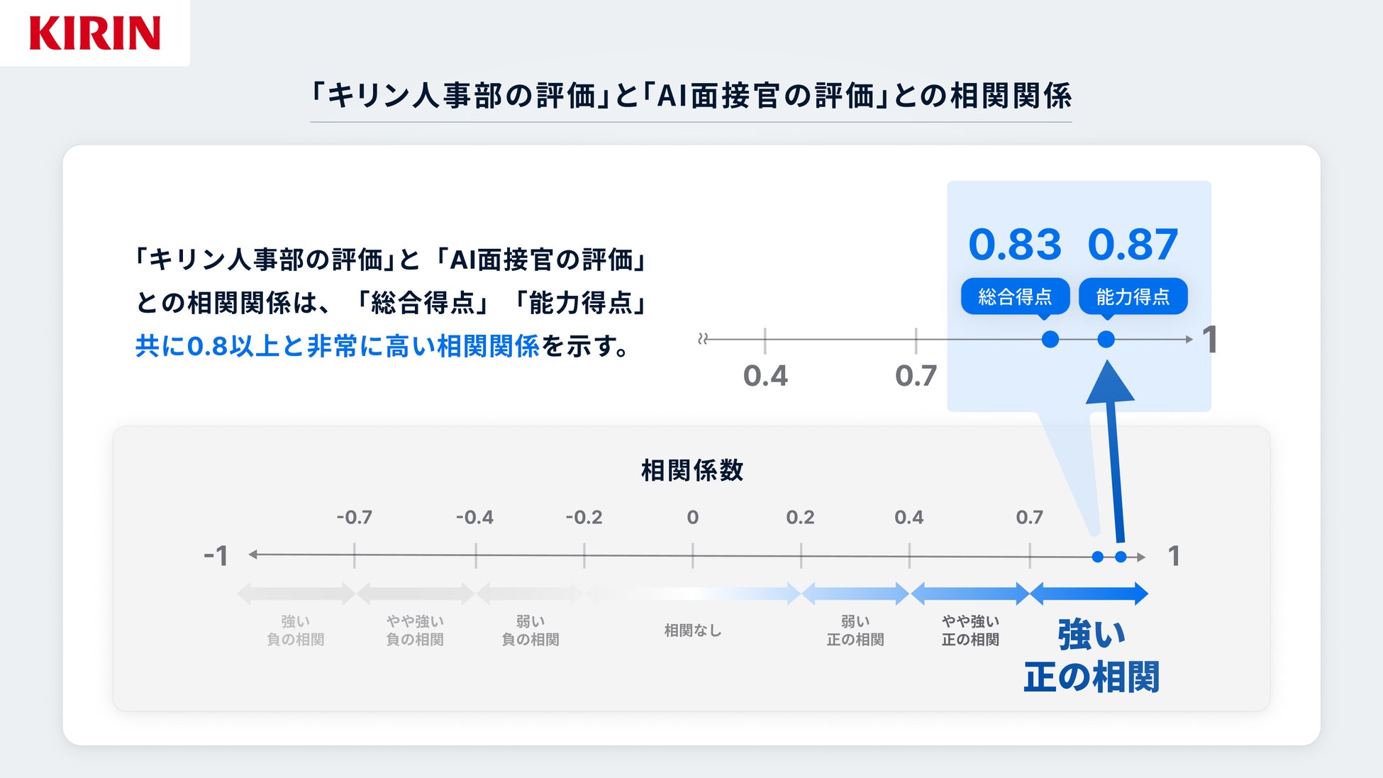 「人事部の評価」と「AI面接官の評価」に強い正の相関 「キリン人事部の評価」と「AI面接官の評価」との相関関係は、総合得点・能力得点ともに0.8以上と、非常に強い相関関係を示しました。