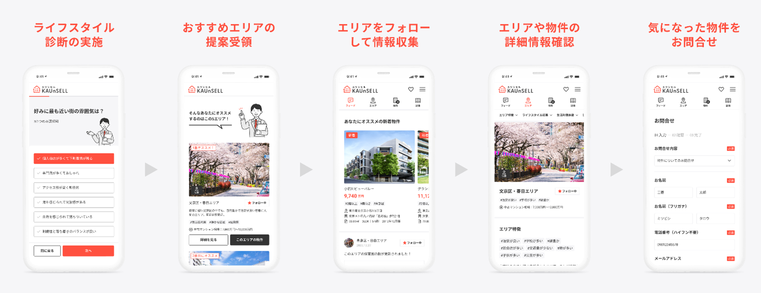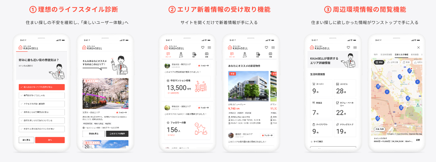 「KAUnSELL」は、ライフスタイルに関する質問に答えることで、「おすすめエリア」が提案され、気になるエリアをフォロー(お気に入り登録)することで、そのエリアに関する様々な最新情報をSNSのように受動的に入手することができます。さらに、様々なサイト等に散在していた住まい探しをする時に欲しかった情報(災害リスク情報、学区情報、相場情報など)をワンストップで閲覧できるWEBサービスです。