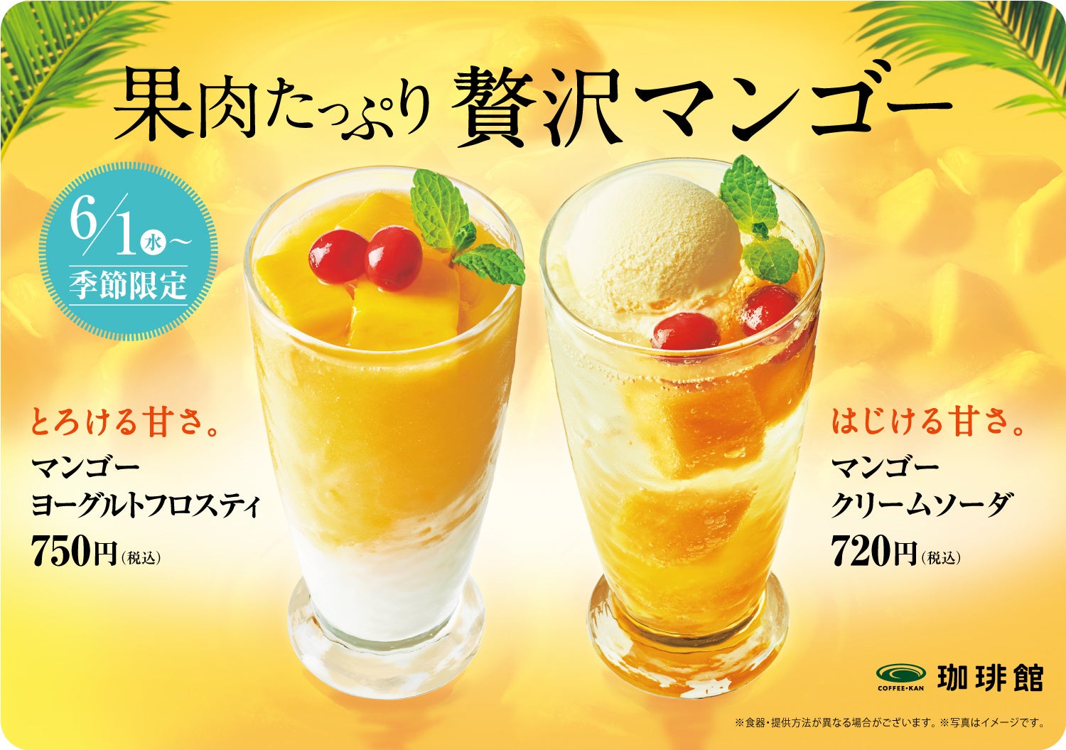 『珈琲館』と『珈琲館 蔵』で、果肉たっぷりのマンゴーを贅沢に使用した夏季限定ドリンクを6月1日より販売
