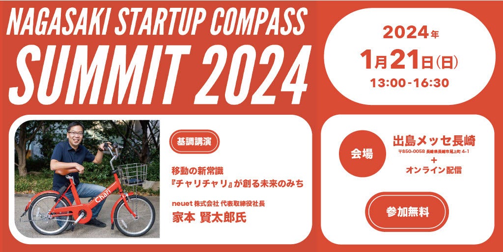 そんな方々へ、街なかの赤い自転車にいつでもパッと乗って、気軽に移動できるシェアサイクルサービス『チャリチャリ』を展開し、移動の常識に変革をもたらすneuet株式会社の家本 賢太郎氏をお呼びし、学生時代に大病を罹患した末に選択した起業という道、好きなことを事業に転換する原動力、経営に対する想いや夢をお話しいただきます。自ら起業を志す方、そしてそれを支えようとする方の背中をそっと押してくれる、そんな講演にご期待ください。
