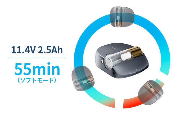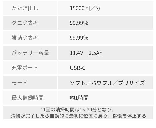 大容量バッテリー内蔵ですので、フル充電1回で最大1時間稼働できます。布団1枚のお掃除は通常15~20分で完了しますので、フル充電後は布団4枚を一気に掃除可能です。