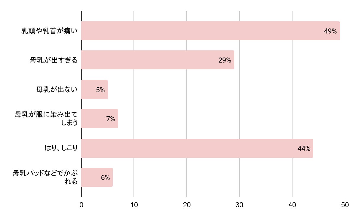 約50%の方が「はりやしこり」「乳首の痛み」などに悩んでいることがわかり、母乳育児期間は多くの方が様々な肌トラブルに悩んでいることがわかります。