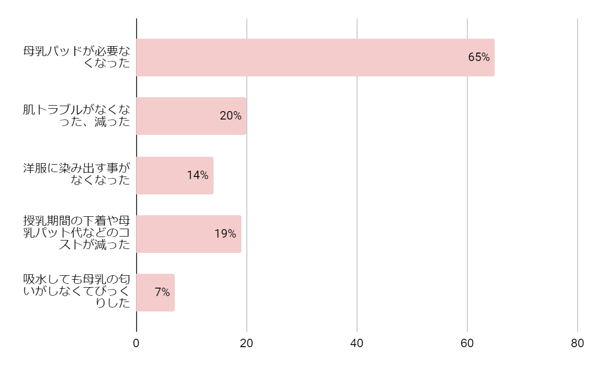 「母乳パッドが必要なくなった」と回答した方が最も多く65%。吸水ブラを利用することで母乳パッドの使用頻度が減り、ママたちの授乳時期のコスト削減につながったと言えます。