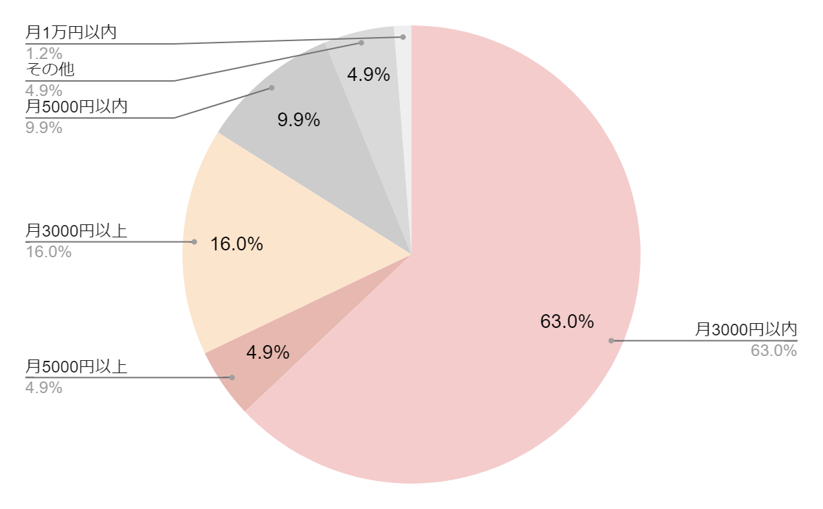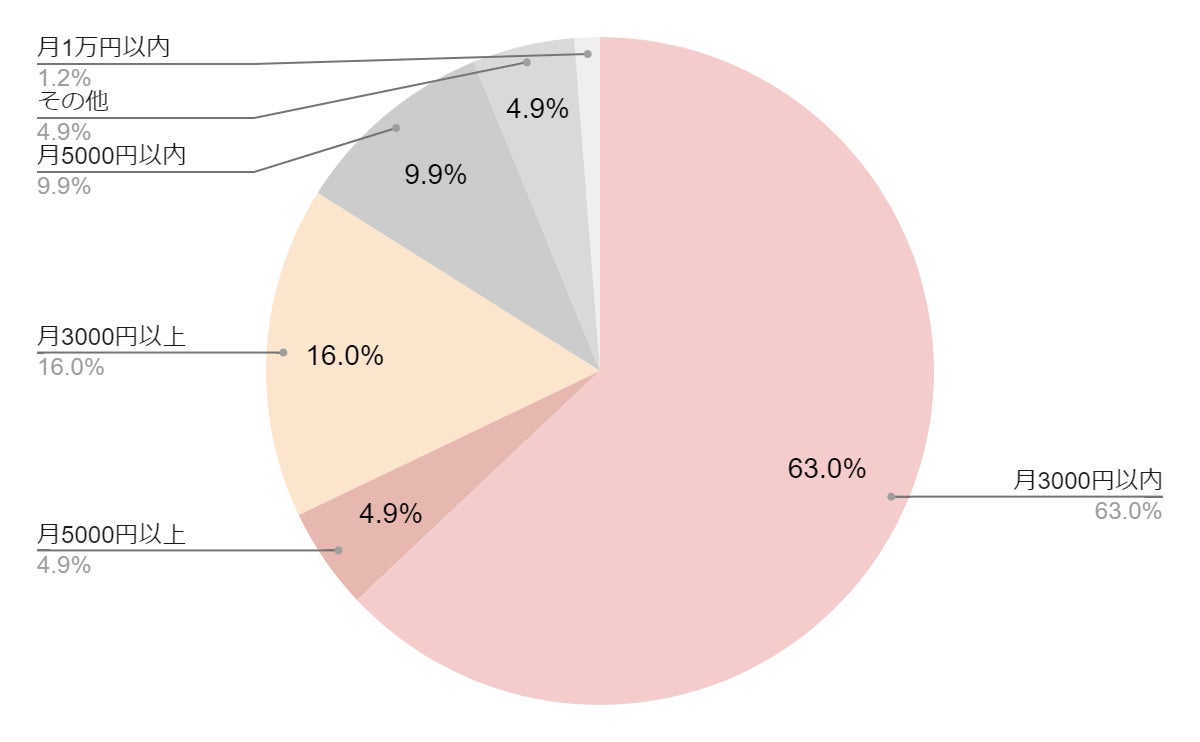 「月3,000円以内」と回答した方が最も多く63%、次いで「月3,000円以上」と回答した方が16%、「月5,000円以内」と回答した方は9.9%でした。