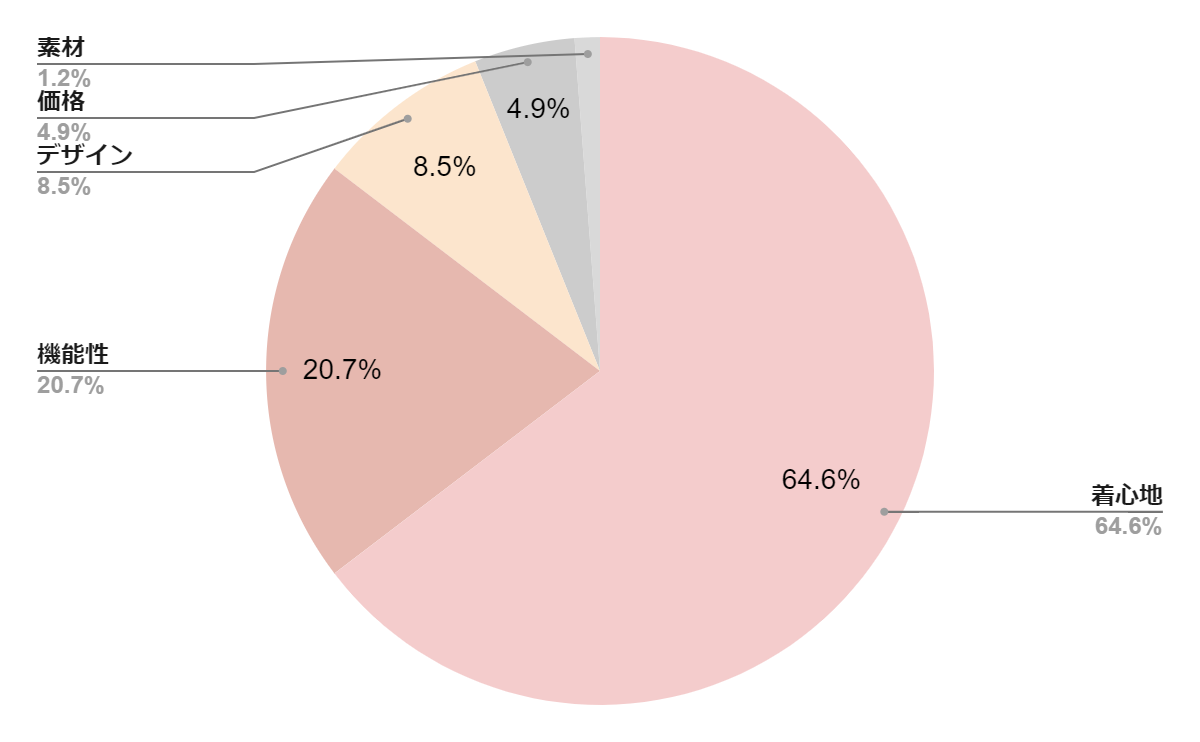 「着心地」が最も多く64.6%、次いで機能性が20.7%でした。肌への影響や着心地を重視する方が多いことが推察されます。