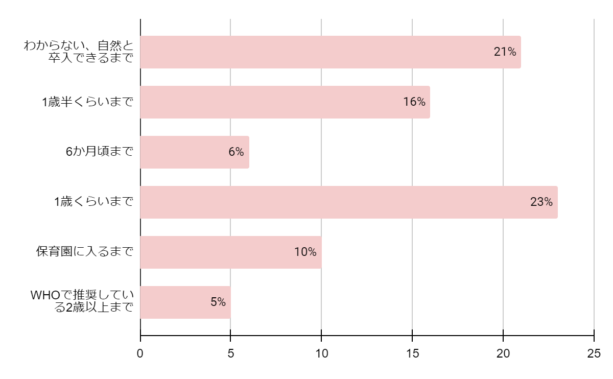 「1歳くらいまでは母乳で育てたい」が最も多く23%、次いで「わからない、自然と卒入できるまで」と回答した方が21%でした。また令和5年乳幼児身体発育調査の概要(※)によると、平成22年においては、平成12年に比べ母乳栄養の割合が増加しており、さらに母乳栄養については、月齢が進んでもその割合が高くなっていることから、母乳でなるべく育てたいという方が増加していることが推察されます。