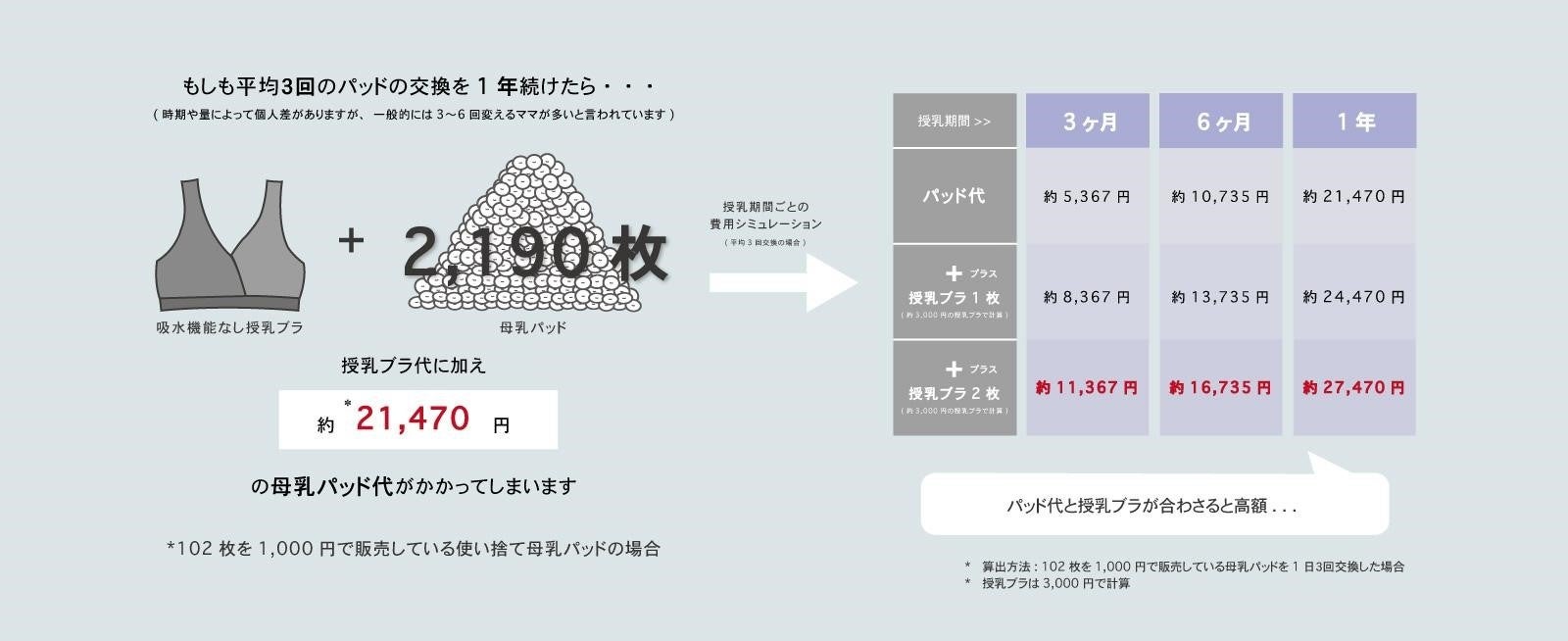 さらに、およそ40%以上の方が1日に3回以上母乳パッドを交換しており、従来の授乳ブラに使い捨ての母乳パッドを約1年利用することで、およそ2万円の母乳パッド代(※)がかかっています。