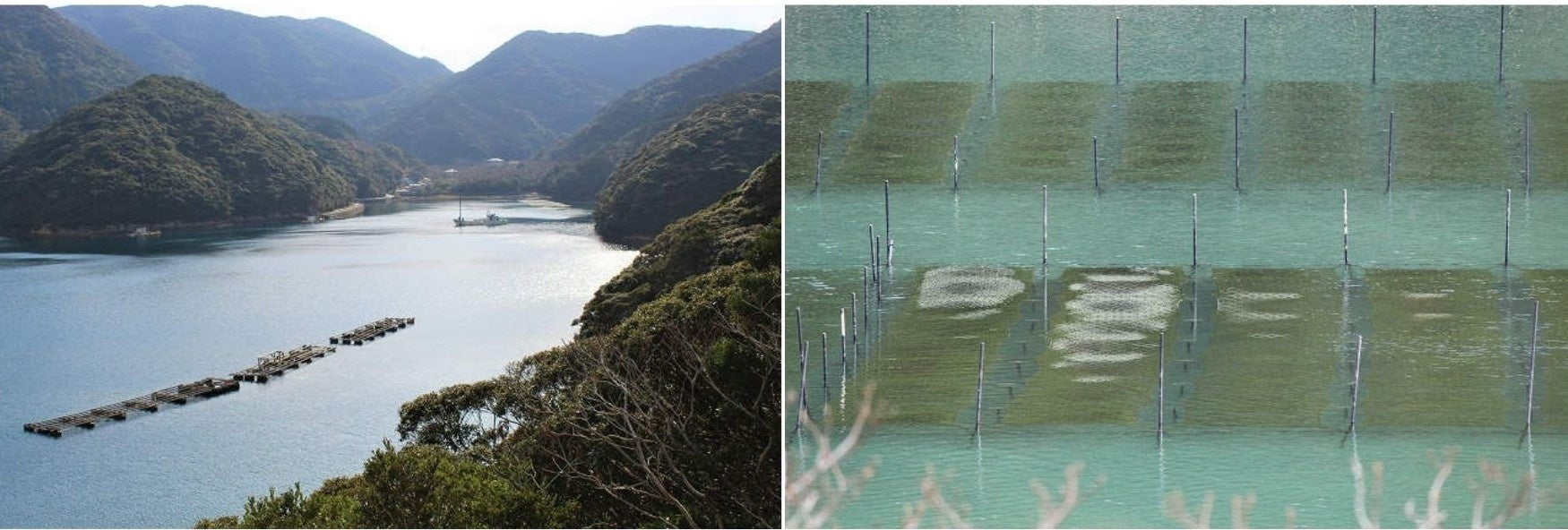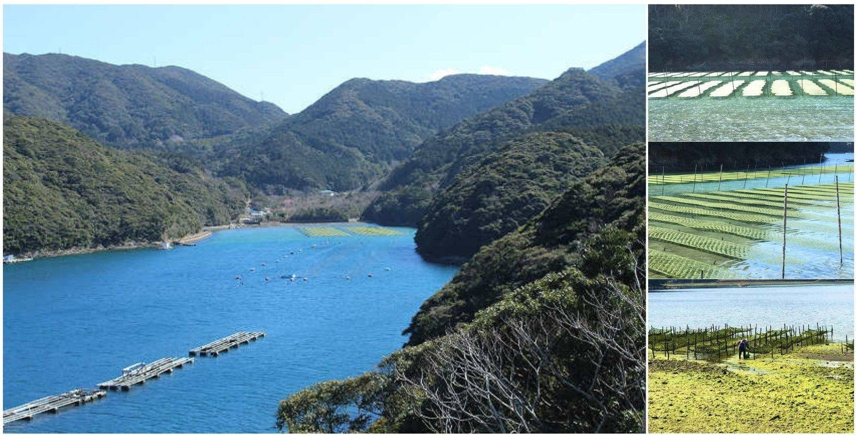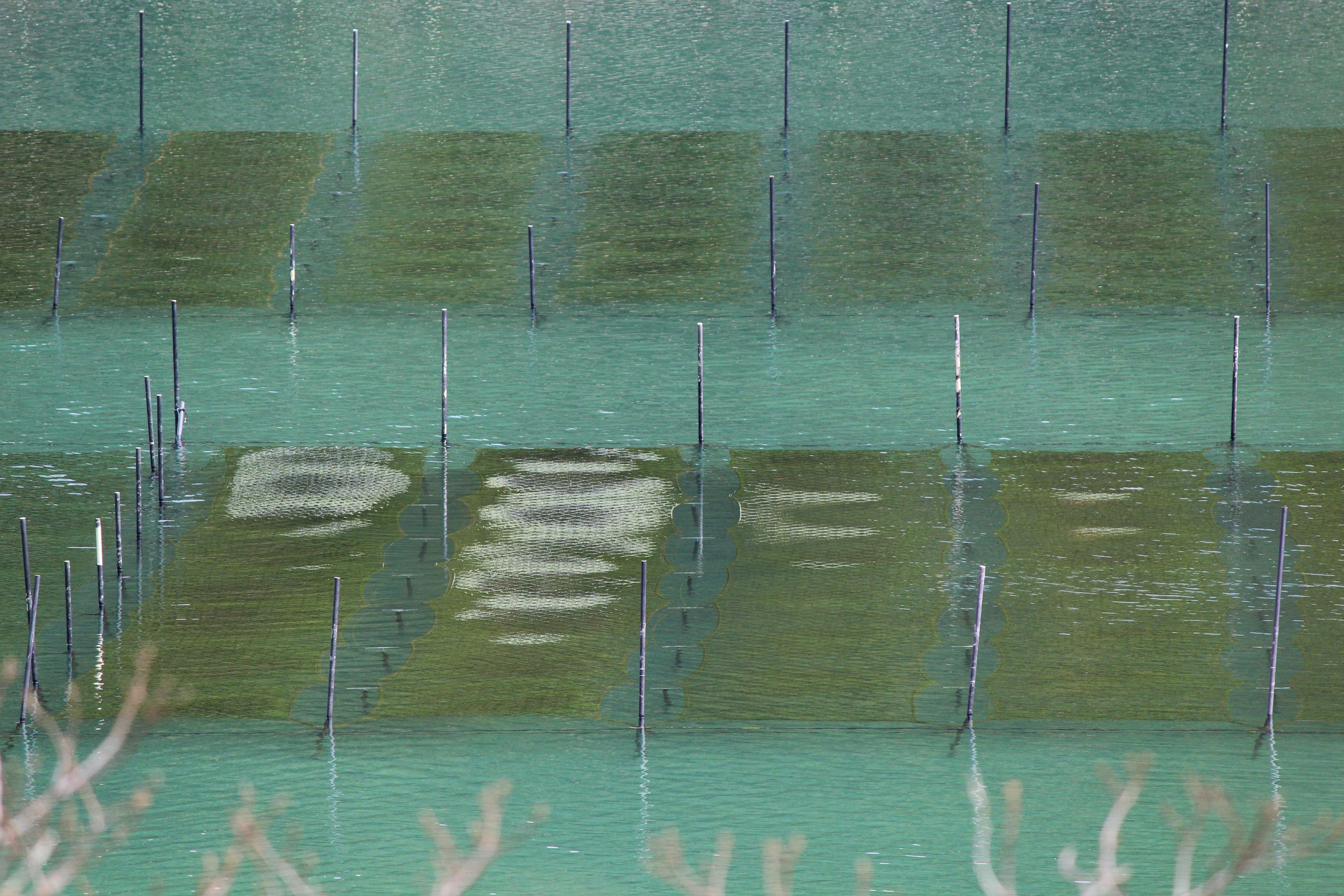 シマリエからお届けするあおさは、複雑に入り組む海岸線と波穏やかな青く澄んだ海に点々と浮かぶ小島の美しい景観を持ち、「長崎県新観光百選」にも選ばれた新上五島町・若松瀬戸で育てたあおさです。秋風がふきはじめるころ、種が付きやすい場所に網をセッティングすることで、海面に浮上してくるあおさの種が自然に網に付着します。あおさが自然に育つ環境をつくるため、網をセッティングする場所や時期は海を知り尽くした漁師の勘と経験に頼るしかありません。台風や気温の変化を読み違えると収穫量にも大きく影響します。若松瀬戸では約2年前から生産をはじめ、今年はじめてシマリエから皆さまへお届けできることになりました。