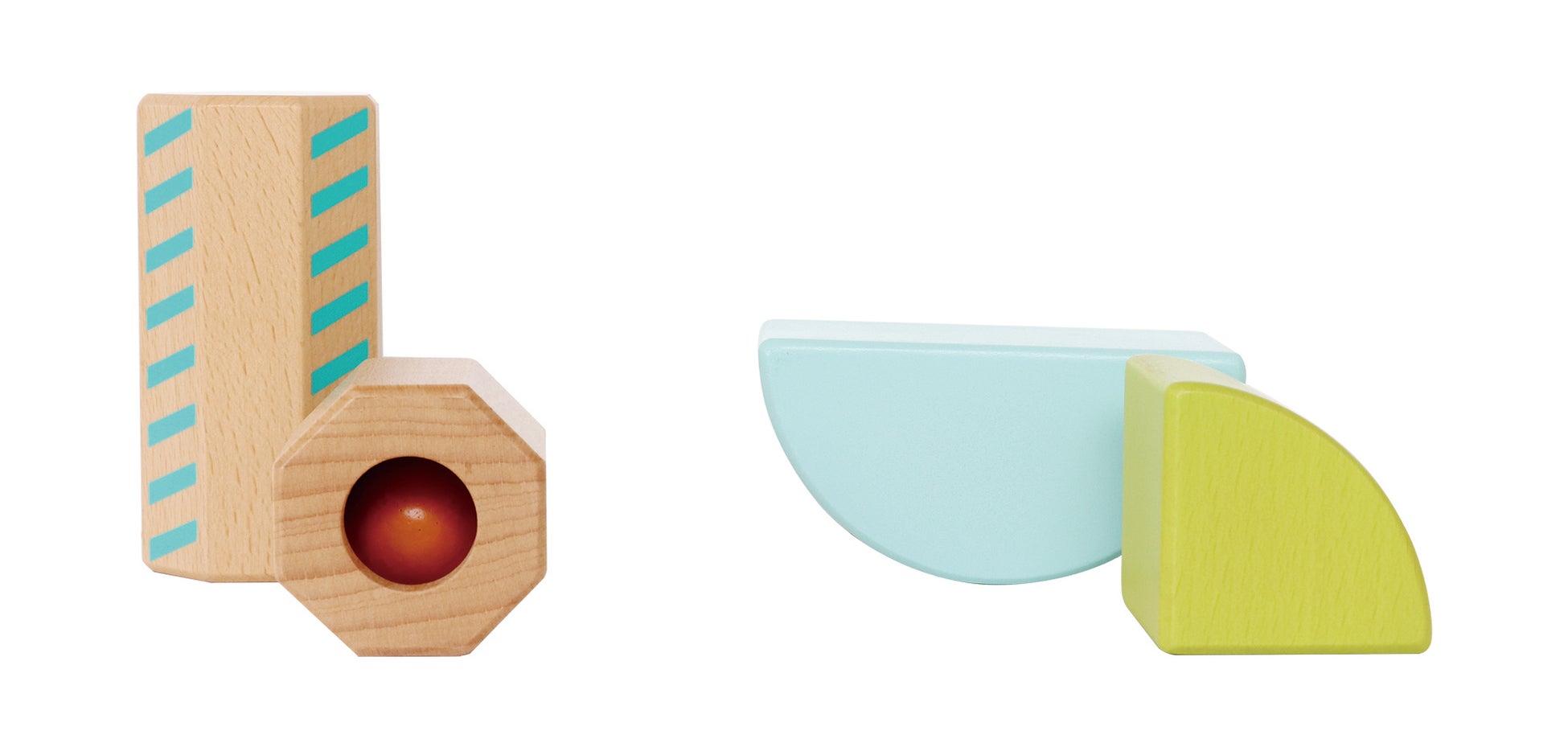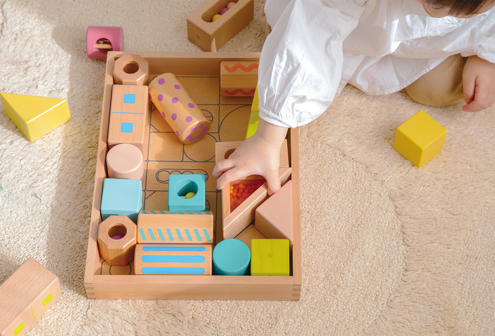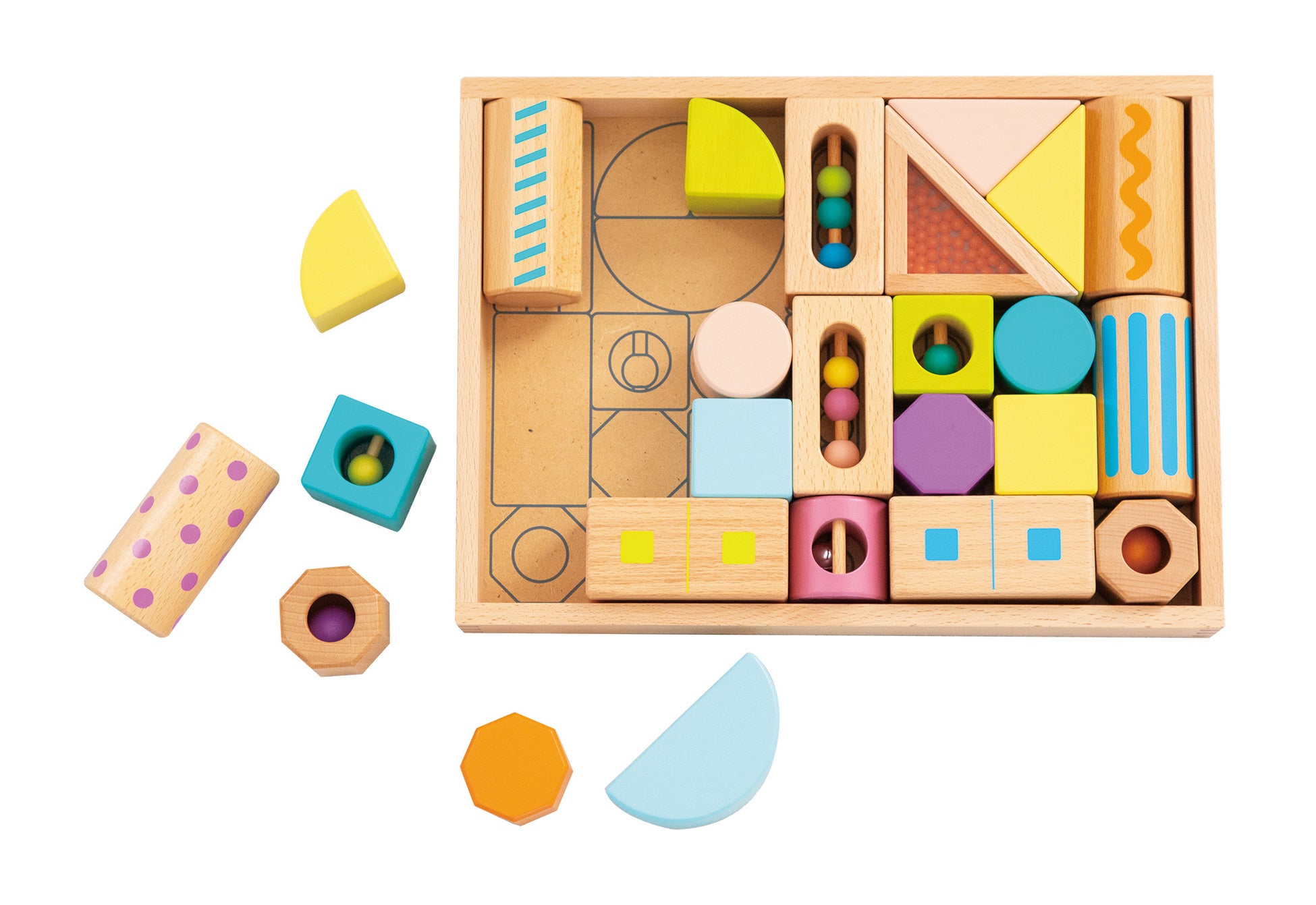 音の種類は全5種類!セットの25ピースすべてのつみきに音の鳴るしかけがあります。つみきの形状ごとに音が異なり、同じ形の仲間には同じ音のしかけが入っています。つみきの形も大・小があり、見比べ・聴き比べあそびを楽しむことができます。