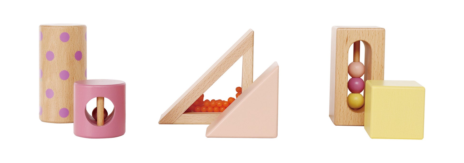 ※写真 左上から:円柱/鈴、三角形/ビーズ、四角形/木球(小)、八角形/木球(大)、半円・おうぎ形/砂