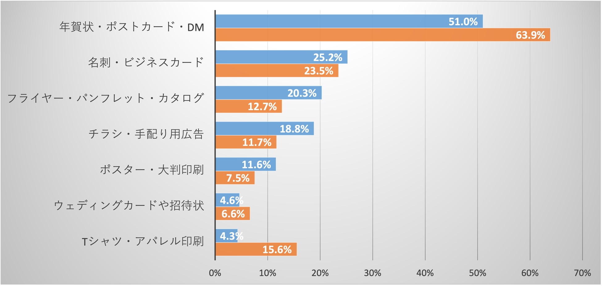 今までに利用したことのある印刷商品と今後利用したみたい商品を比較すると、利用したことのあるものの約半数を占めていた「年賀状・ポストカード・DM」は、今後も利用意向が見られます。また、今後利用してみたい商品として、「Tシャツ・アパレル印刷」が上がってきました。コメントの中には、「アクリルスタンド」や「うちわ」など、趣味やクリエイティブな活動を支えるオリジナルグッズ制作にもニーズがあることがわかりました。