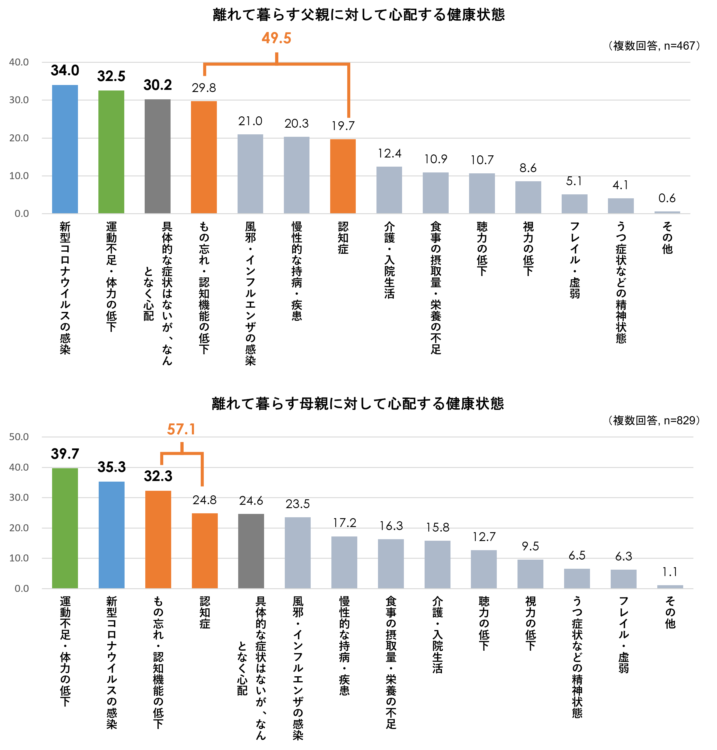 離れて暮らす親の健康に対して「心配している具体的な健康状態」について聞いたところ、父親では「新型コロナウイルスの感染」 34.0%、「運動不足・体力低下」 32.5%、「具体的な症状はないが、なんとなく心配」30.2%の順という結果になりました。一方、母親では「運動不足・体力低下」 39.7%、「新型コロナウイルスの感染」 35.3%、「もの忘れ・認知機能の低下」 32.3%という結果になっています。また、「もの忘れ・認知機能の低下」 と「認知症」の2つを合計した“脳機能低下”でみると父親・母親それぞれ49.5%、57.1%とトップとなり、親の脳機能低下に対する心配が顕著な様子が伺えます。