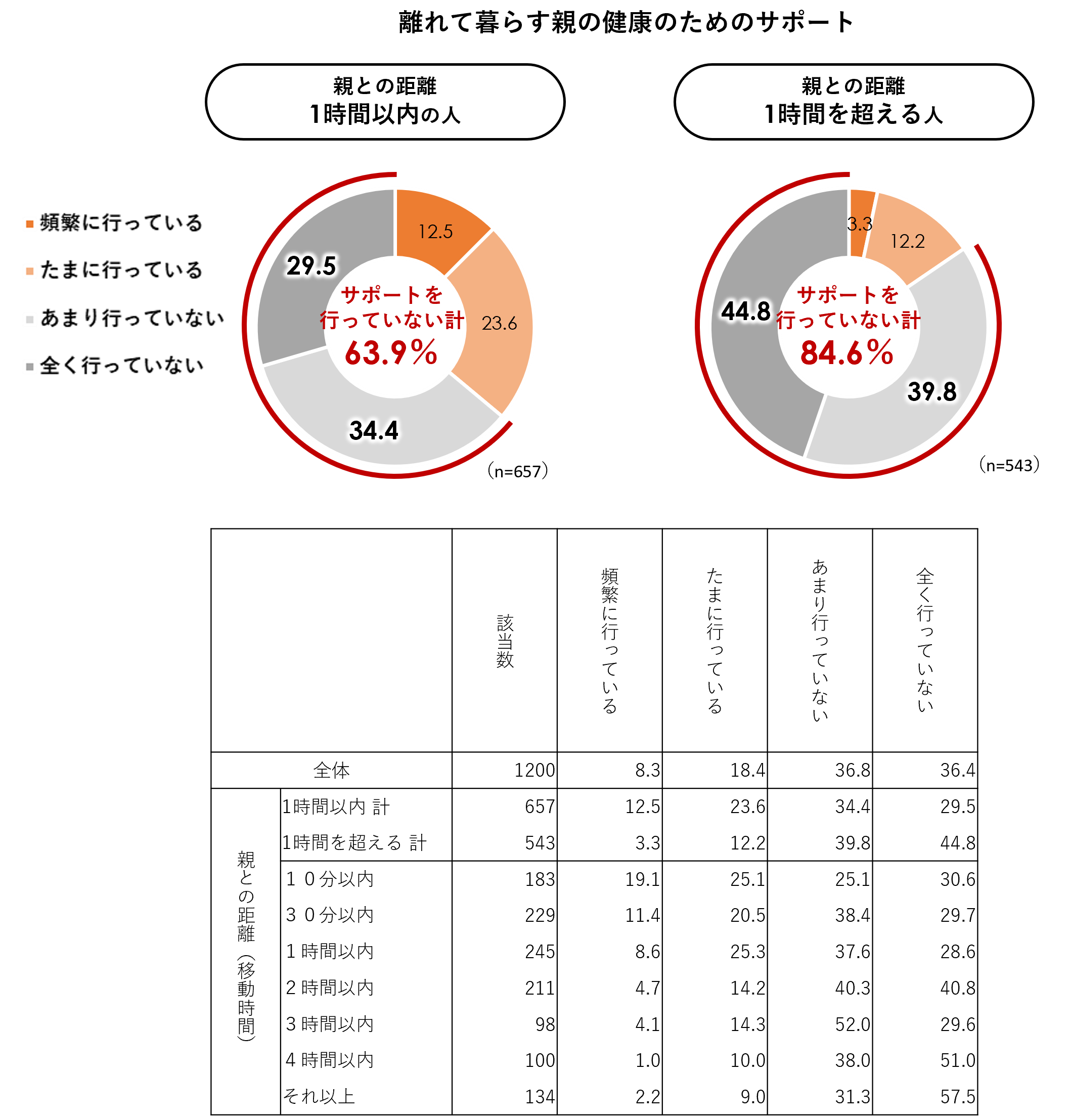 コロナ禍で離れて暮らす親に会えない中、親の健康のためのサポートについても、親との距離1時間を超える人は、8割以上の人が「サポートを行っていない」結果になっており、親との距離1時間以内の人と20%以上の差が生じています。