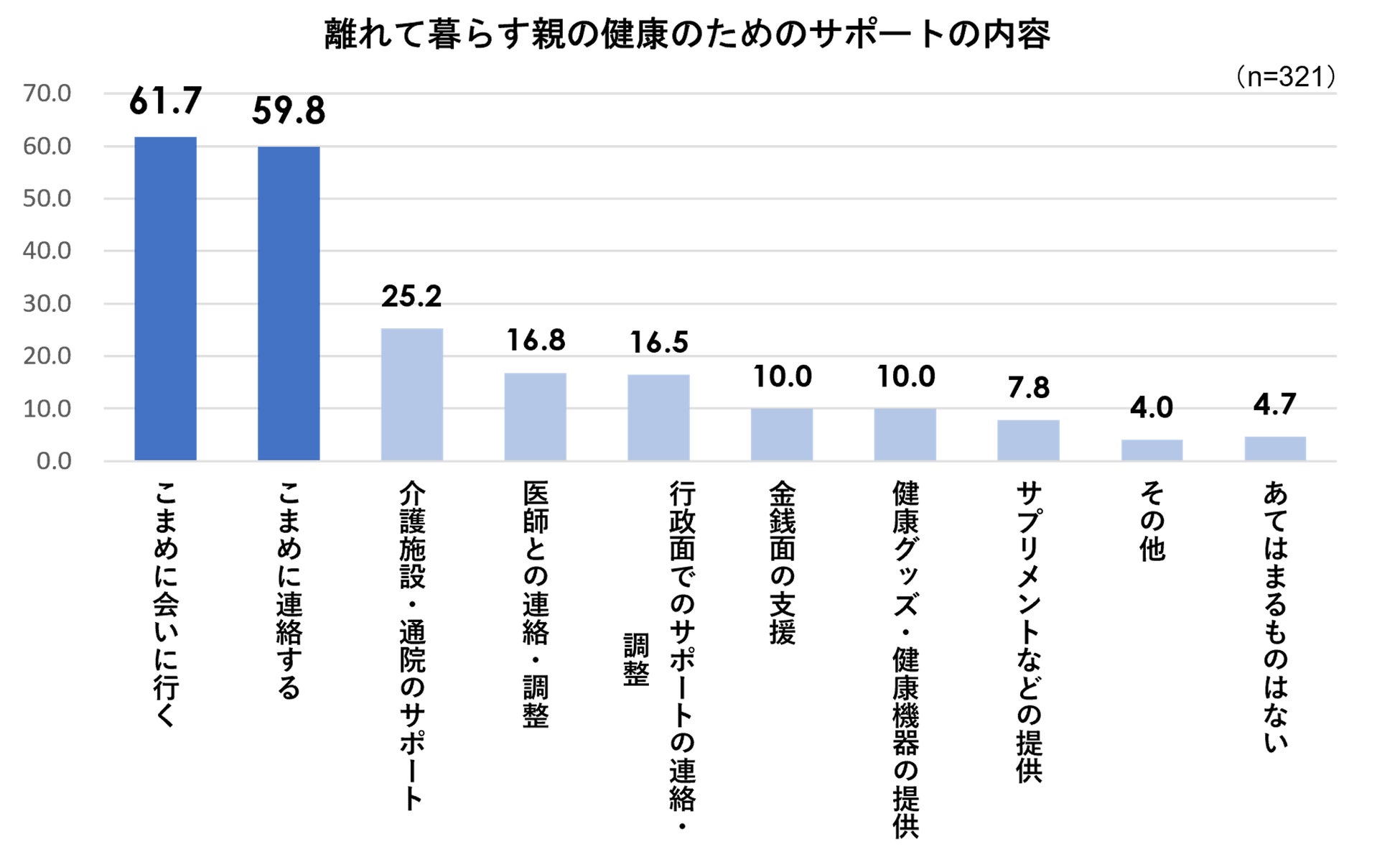 離れて暮らす親のためにサポートを行っていると答えた人(321名)に「具体的なサポートの内容」を聞いたところ、「こまめに会いに行く」( 61.7%)と「こまめに連絡する」( 59.8%)が顕著に高い結果になっています。