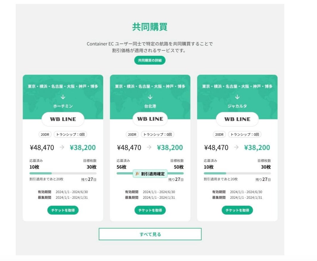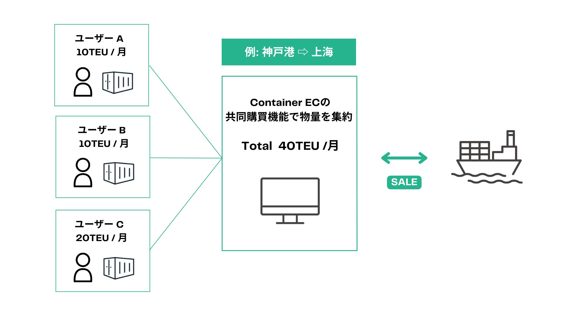 他にも「共同購買」という仕組みにより、特定の輸出先に対してContainer ECユーザー内で共同発注を行い物量を集約。物量が増えることで少ない出荷数でも単価交渉が可能となりました。