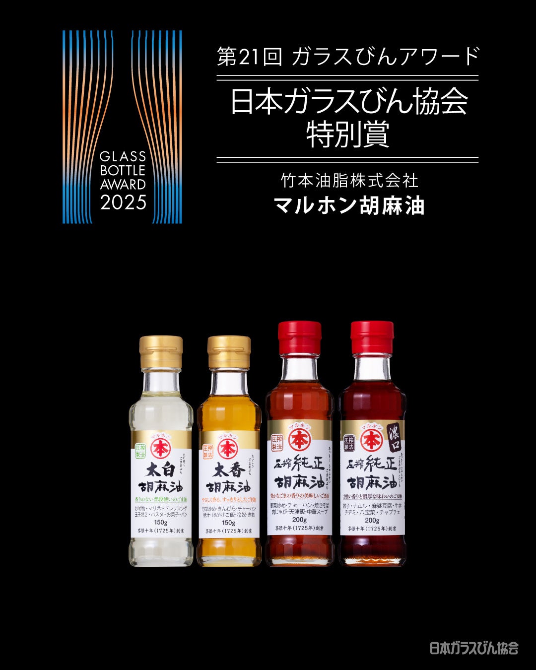 竹本油脂株式会社は日本ガラスびん協会が主催する「第21回ガラスびんアワード 2025」において、日本ガラスびん協会特別賞を受賞いたしました。