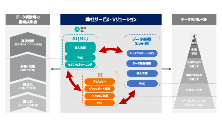 このような背景から、弊社が提供するDWH(データウェアハウス)をはじめとしたデータ基盤構築、およびBI導入支援のノウハウといった”データ活用”の知見をベースにDataikuのAI・機械学習プラットフォームを掛け合わせた顧客企業のデータ活用の高度化に寄与することを目的に、この度コンサルティングパートナー契約を締結する運びとなりました。