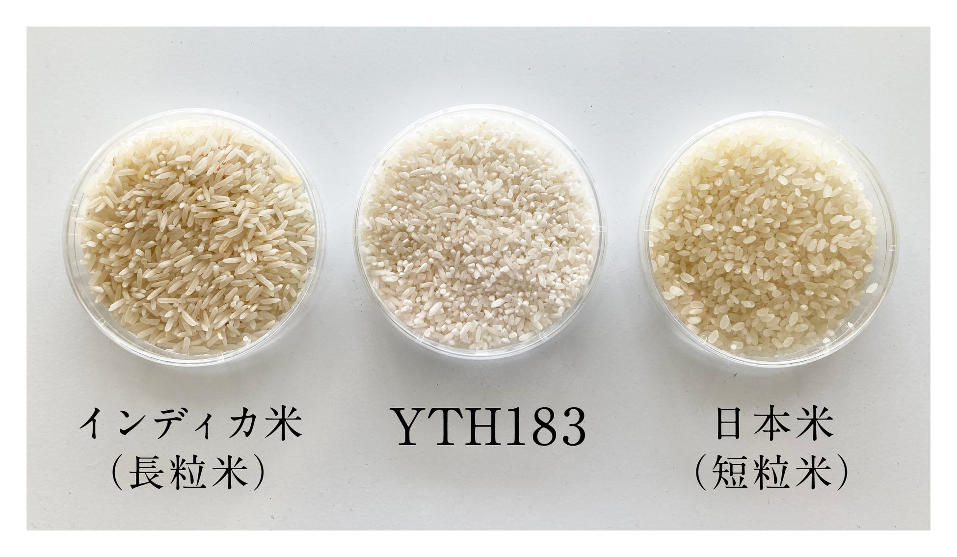 インディカ米品種(長粒米)と日本米品種(短粒米)の交配により誕生し、粒形はインディカ米よりはやや円粒で、日本米よりは細長い。