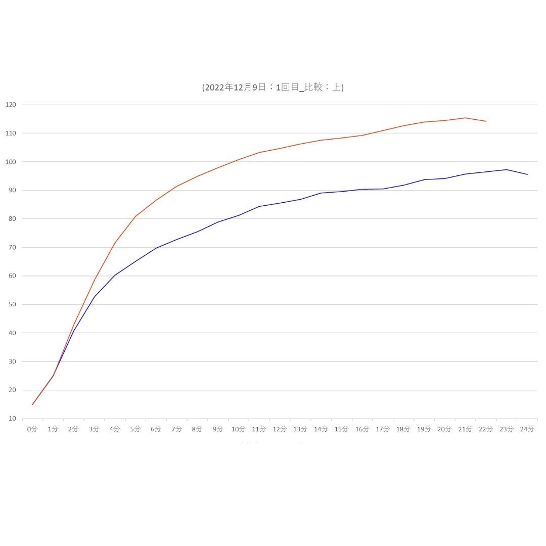 従来品と比較して温度上昇のスピードが早い。最高温度も高く、外気温が低くても十分熱い。