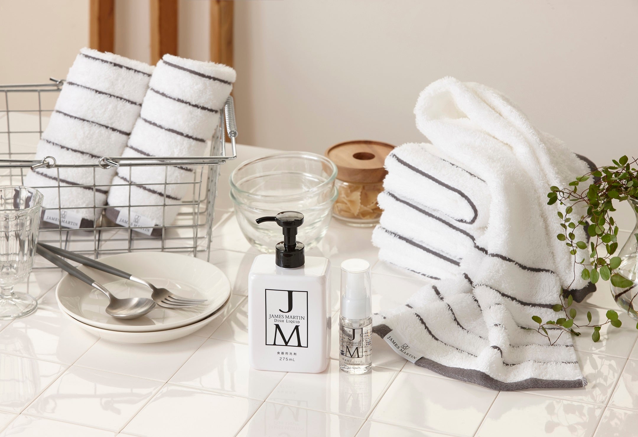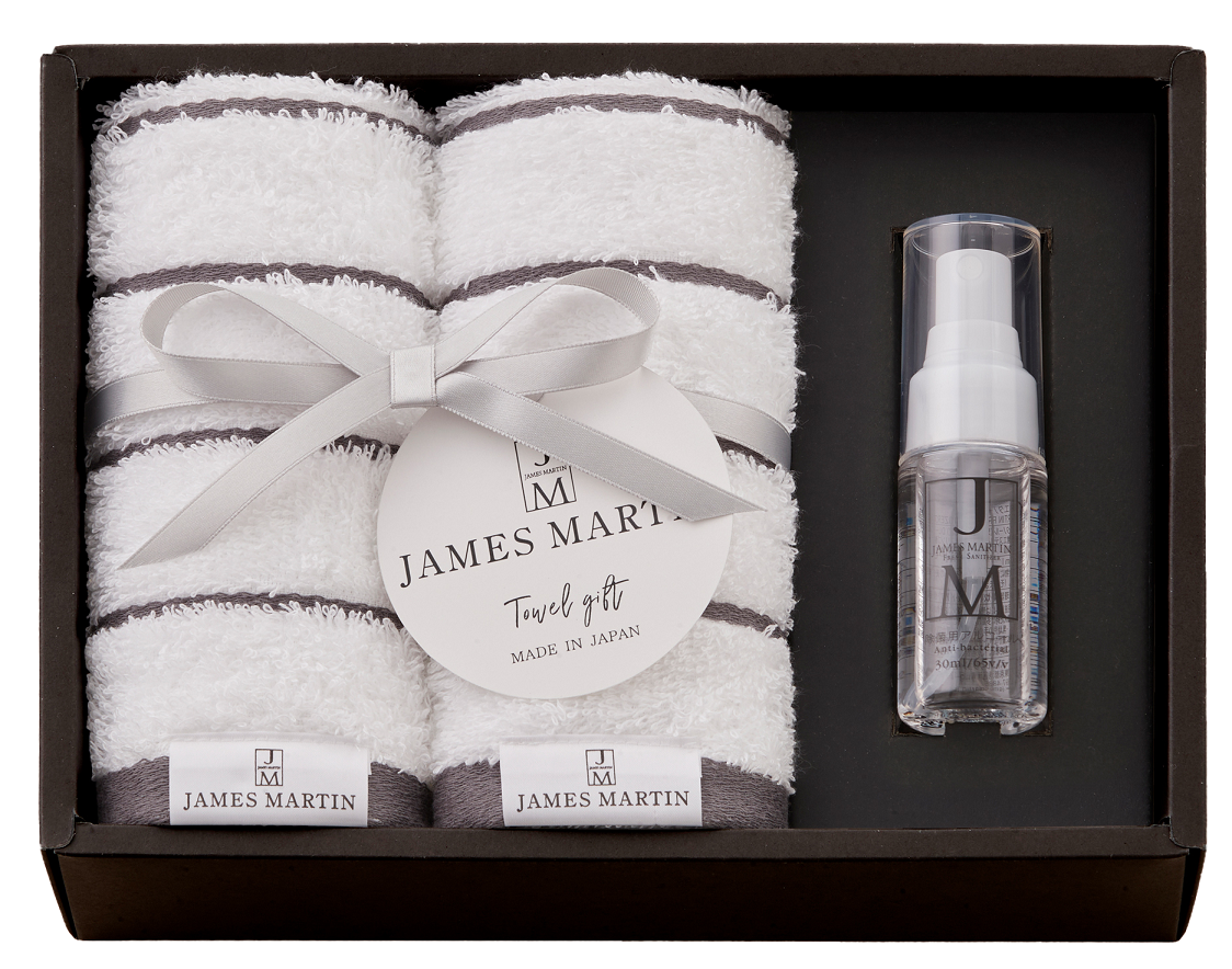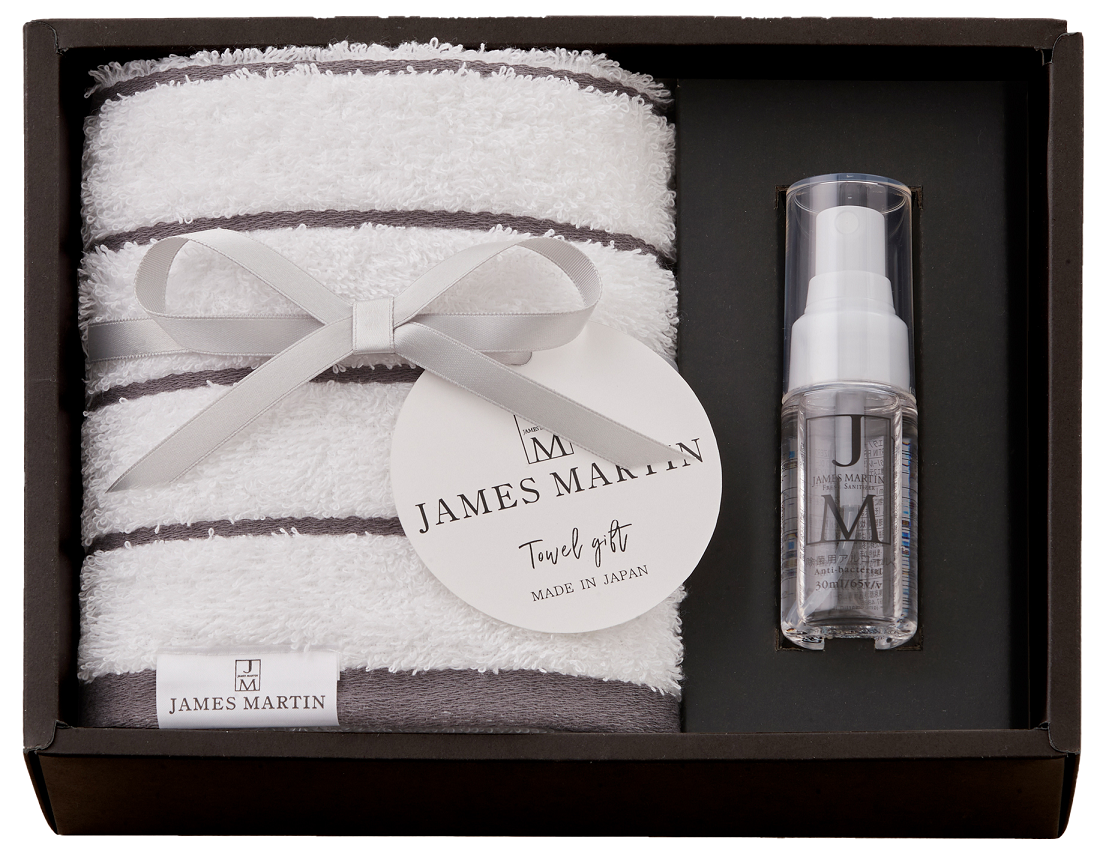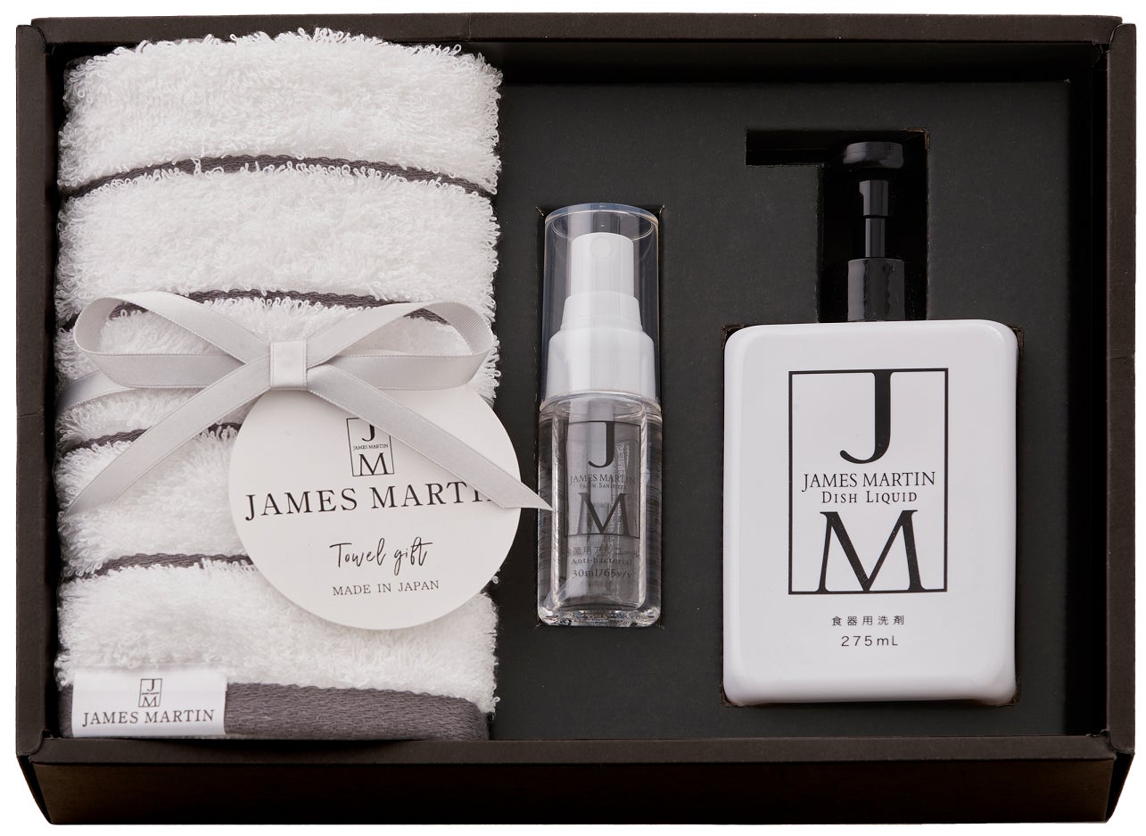 この度発売するタオルギフトは、ジェームズマーティンの特徴であるシンプルなデザインに併せたグレーのボーダー柄の抗菌加工タオルと、ジェームズマーティンの定番商品の食品成分のみで作られた安心安全なアルコール製剤 フレッシュサニタイザー、手肌にやさしく少量で汚れが落とせる食器用洗剤ディッシュリキッドをセットにしたギフトです。「暮らしの景色を美しく」をコンセプトにデザイン性と機能性を両立した商品開発をしてきた経験を活かし、タオルの仕様についてもデザインだけでなく抗菌加工についてもこだわり、繊維専門商社であるスタイレム瀧定大阪株式会社にふんわり柔らかな肌触りで吸水性に優れた泉州タオルをご提案いただきました。キッチンや洗面所などお使いいただくもの、持ち歩き用のものなど毎日のいろいろな場面でお使いいただけるギフトセットです。是非この機会に、大切な方へのプレゼントに、毎日使える高品質なアイテムが詰まったジェームズマーティンのタオルギフトを贈ってみてはいかがでしょうか。