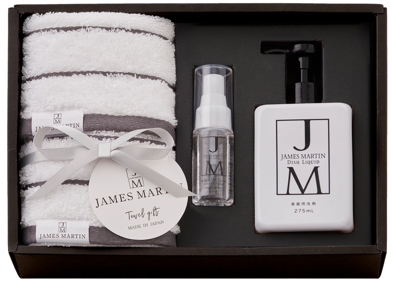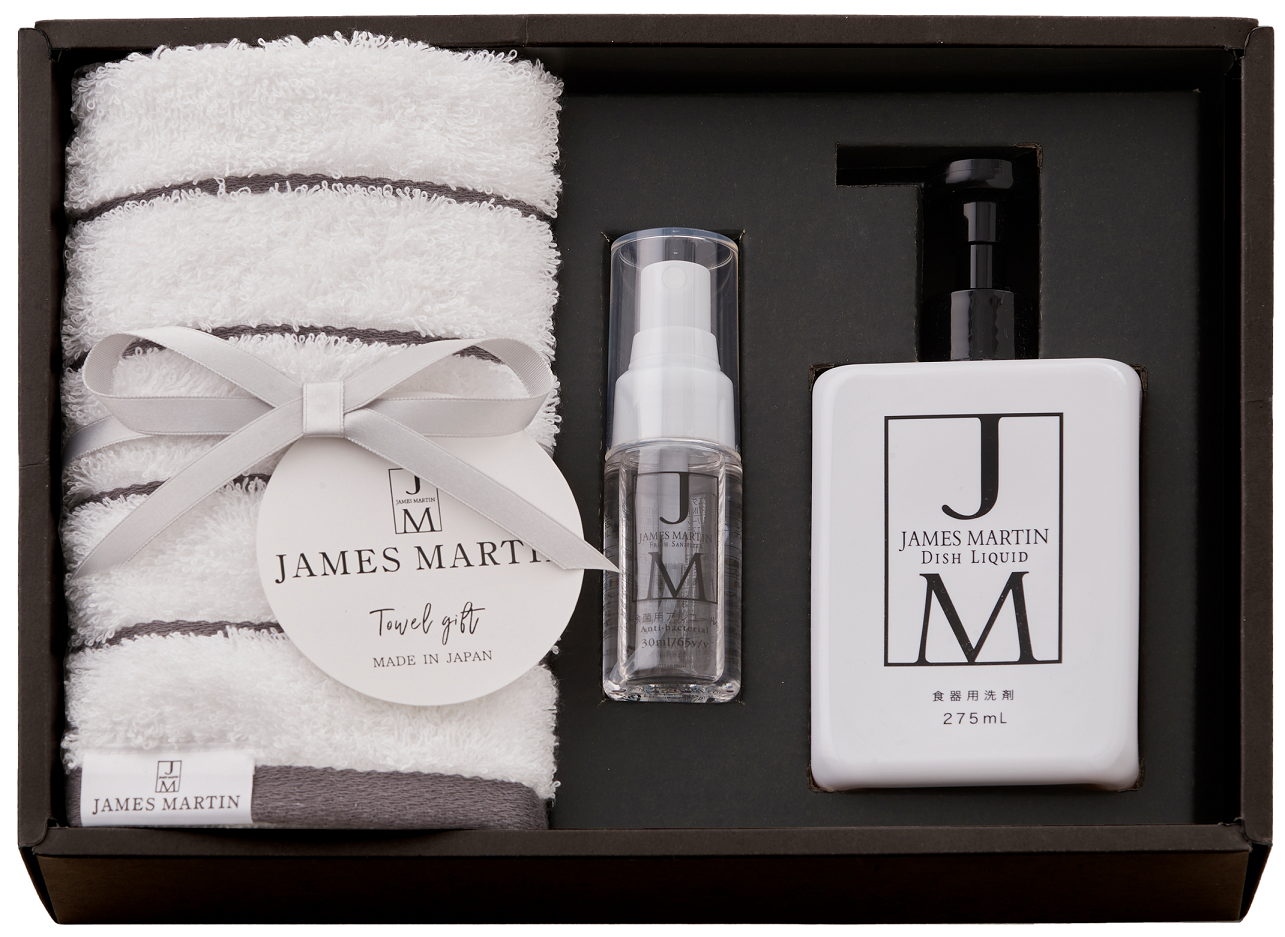 ジェームズマーティン フレッシュサニタイザー、食器用洗剤ディッシュリキッドと、抗菌加工を施した柔らかな肌ざわりの泉州タオルをモノトーンのスタイリッシュなボックスにセットしたどなたにも贈りやすい日本製のギフトです。