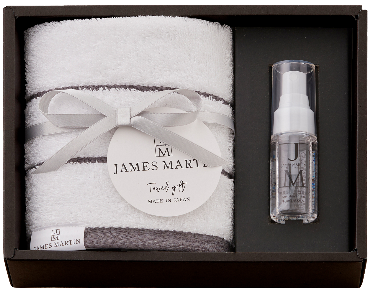 ■商品概要:ジェームズマーティン フレッシュサニタイザー、食器用洗剤ディッシュリキッドと、抗菌加工を施した柔らかな肌ざわりの泉州タオルをモノトーンのスタイリッシュなボックスにセットしたどなたにも贈りやすい日本製のギフトです。