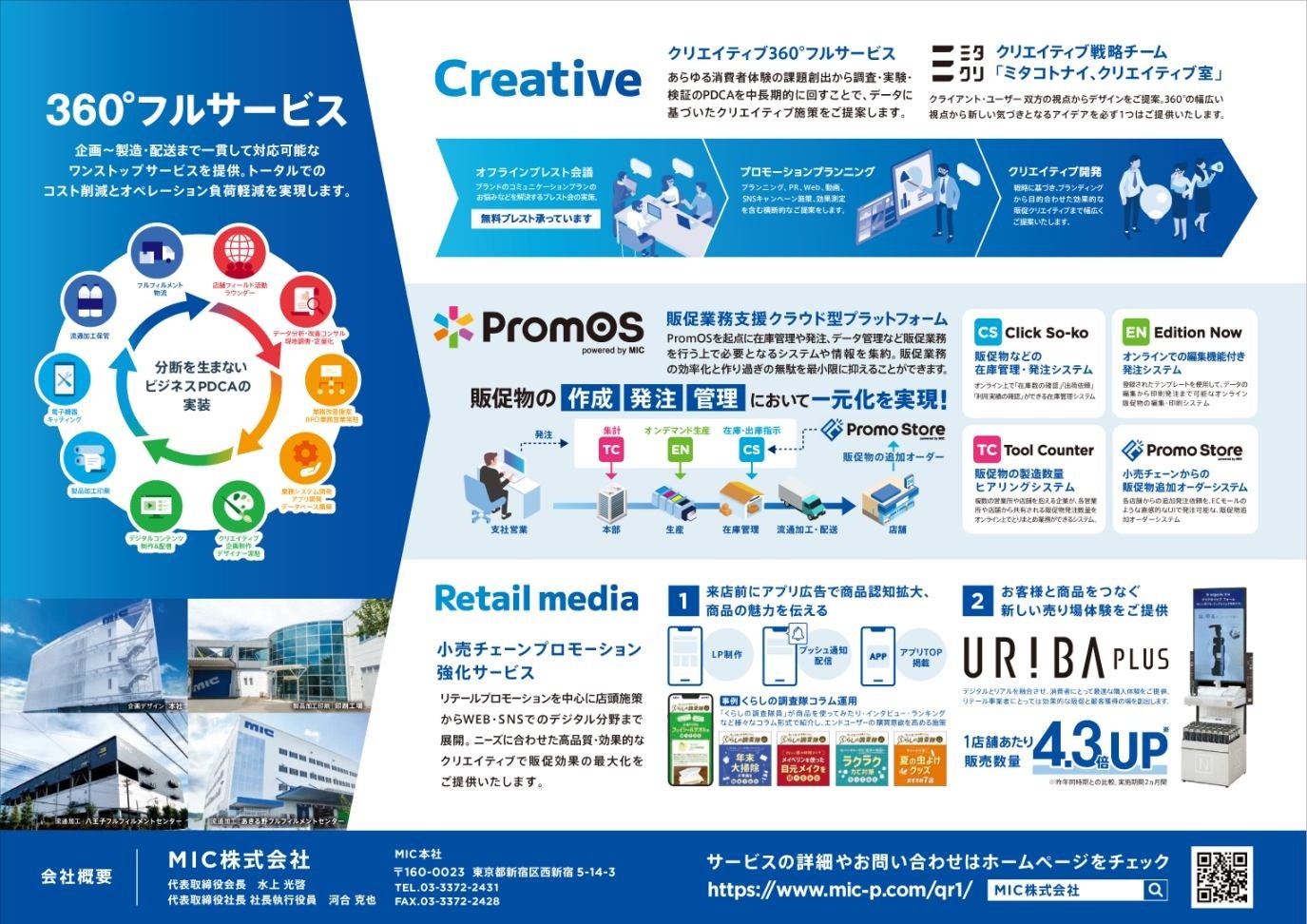 MICは「デジタル×フィジカルで“企業の未来にイノベーションを起こす”」という理念の下、ドラッグストアをはじめとする小売チェーンの作業負荷の軽減や、メーカー企業の販促業務を改善し無駄を減らし担当者の「時間」を創出するといった支援を行っております。今回、「販促革命」をテーマに企画・製造・在庫・配送・効果検証までを一貫体制で対応していることをパネル展示で紹介いたします。
