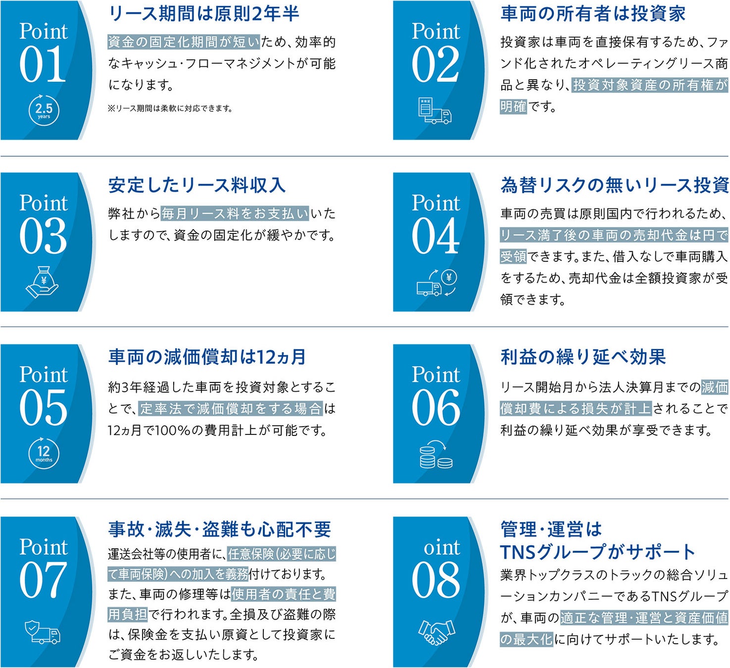 「投資deスグのり」は、トラックを対象とした“オペレーティングリース”と“投資”を組み合わせた投資商品です。投資家はトラックを購入して車両の所有者となり、車両を弊社等にオペレーティングリース(貸し出し)しリース料を毎月受け取りながら、減価償却費を計上します。そして、リース満了時には車両を売却することで、売却代金と受領するリース料の合計で投資資金を上回る収益を目指す商品です。この投資を通じて、投資家はリース料による安定収入を得ながら利益の繰り延べ効果を享受することができます。