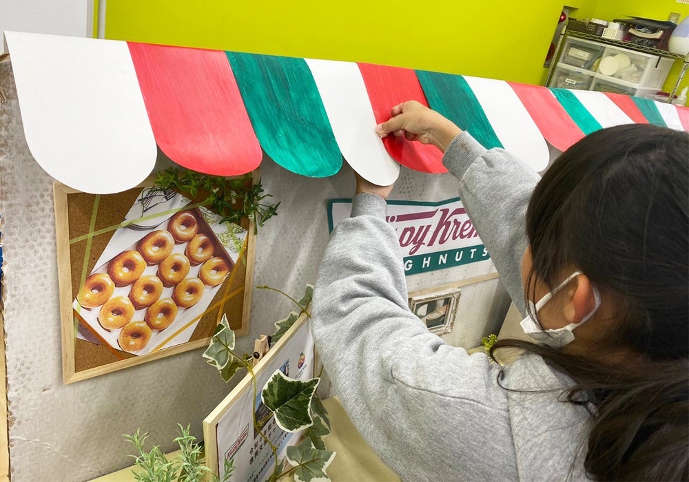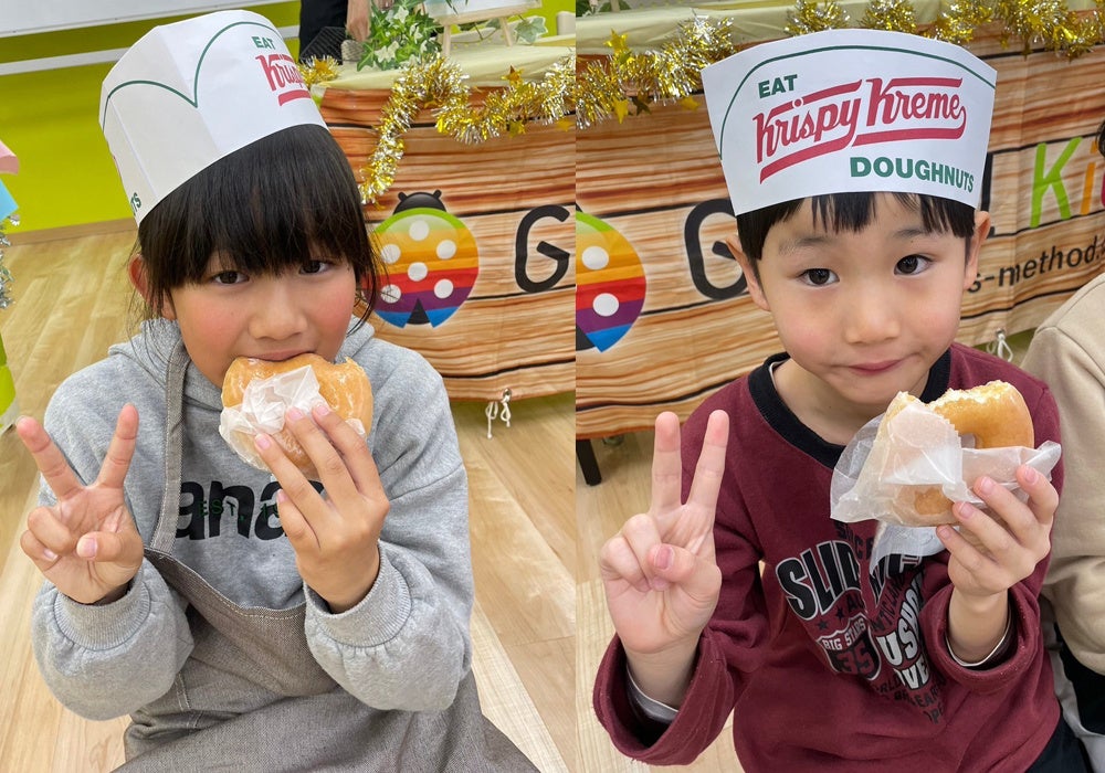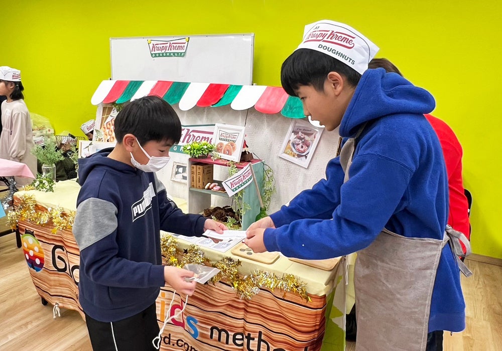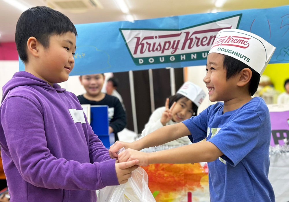 子どもたち自身がブースのデザインや飾り付けを考え、各ブースに分かれてお客様をお迎えしました。「いらっしゃいませ~」、「ありがとうございました。」、「またお越しください!」と、大きな声での接客も素晴らしく、チームで協力する経験を通じて、コミュニケーション能力や協調性の向上を育みました。そして注文箱数と合計金額の確認、おつりの計算等々。最後まで諦めず一生懸命に取り組み、販売開始から約1時間半で90箱全てのドーナツを完売することができました。