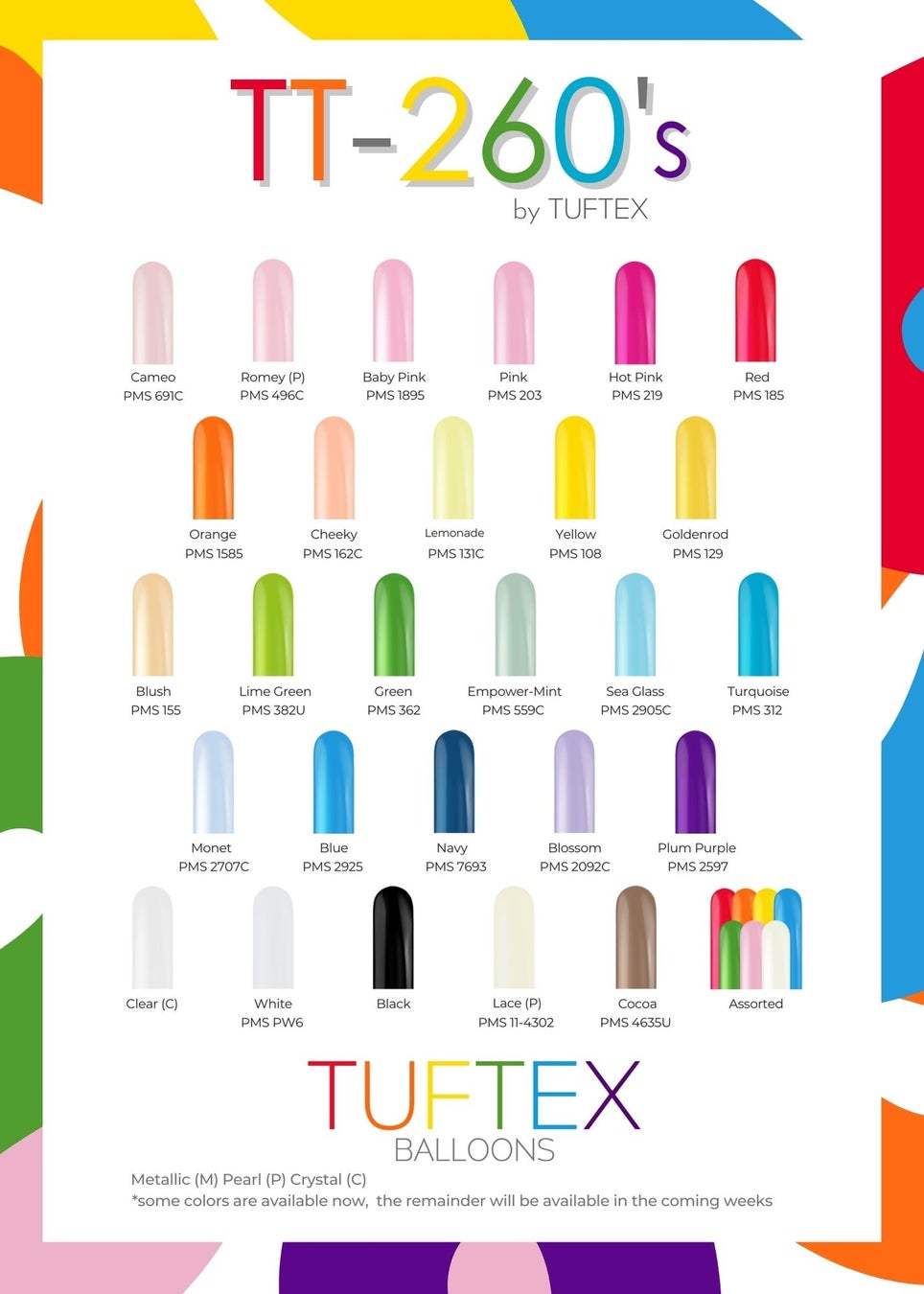 タフテックスゴム風船のカラーバリエーションは72色以上、サイズは5インチ(13cm)、11インチ(28cm)、17インチ(42cm)、24インチ(60cm)、36インチ(90cm)、そして260Tシリーズが揃い、洗練されたバルーンデコレーションやパフォーマンスを可能にします。キッシーズでは、在庫を随時補充し、フルラインナップで取り揃える予定です。