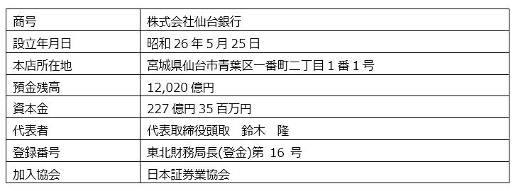 2018年4月より、当社の親会社である株式会社SBI証券(本社:東京都港区、代表取締役社長:髙村 正人、以下「SBI証券」といいます。)と仙台銀行は、金融商品仲介業サービスでの業務提携を開始し、仙台銀行のお客さまは同行WEBサイトを通じてSBI証券に証券総合口座を開設することで、SBI証券の取扱う多様な金融商品・サービスをご利用いただくことが可能となっております。